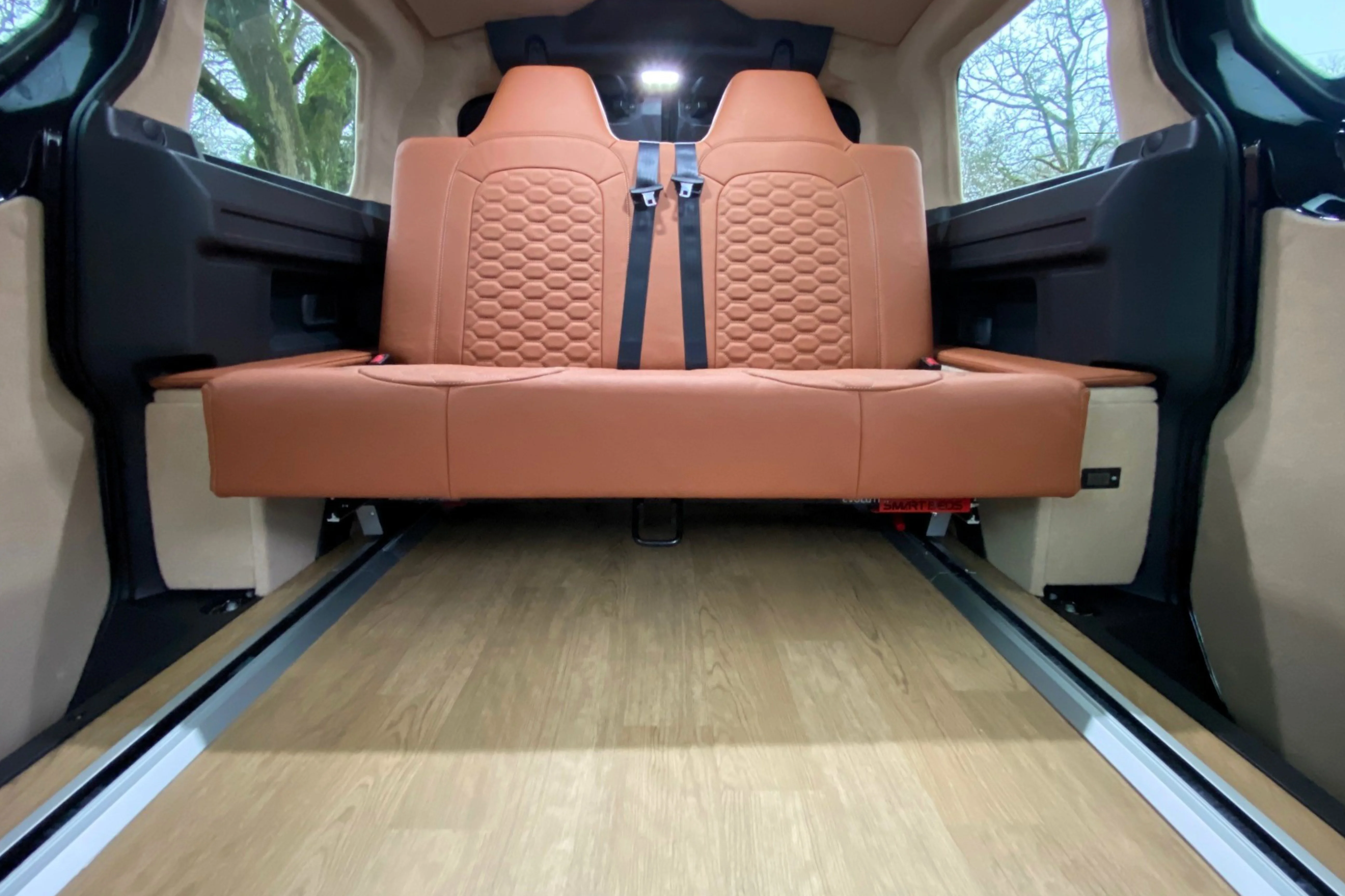Our Volkswagen ID. Buzz Kombi Sleeper conversion, offering rear travelling seats to a Cargo van in the form of an M1 certified crash tested bed on rail system.