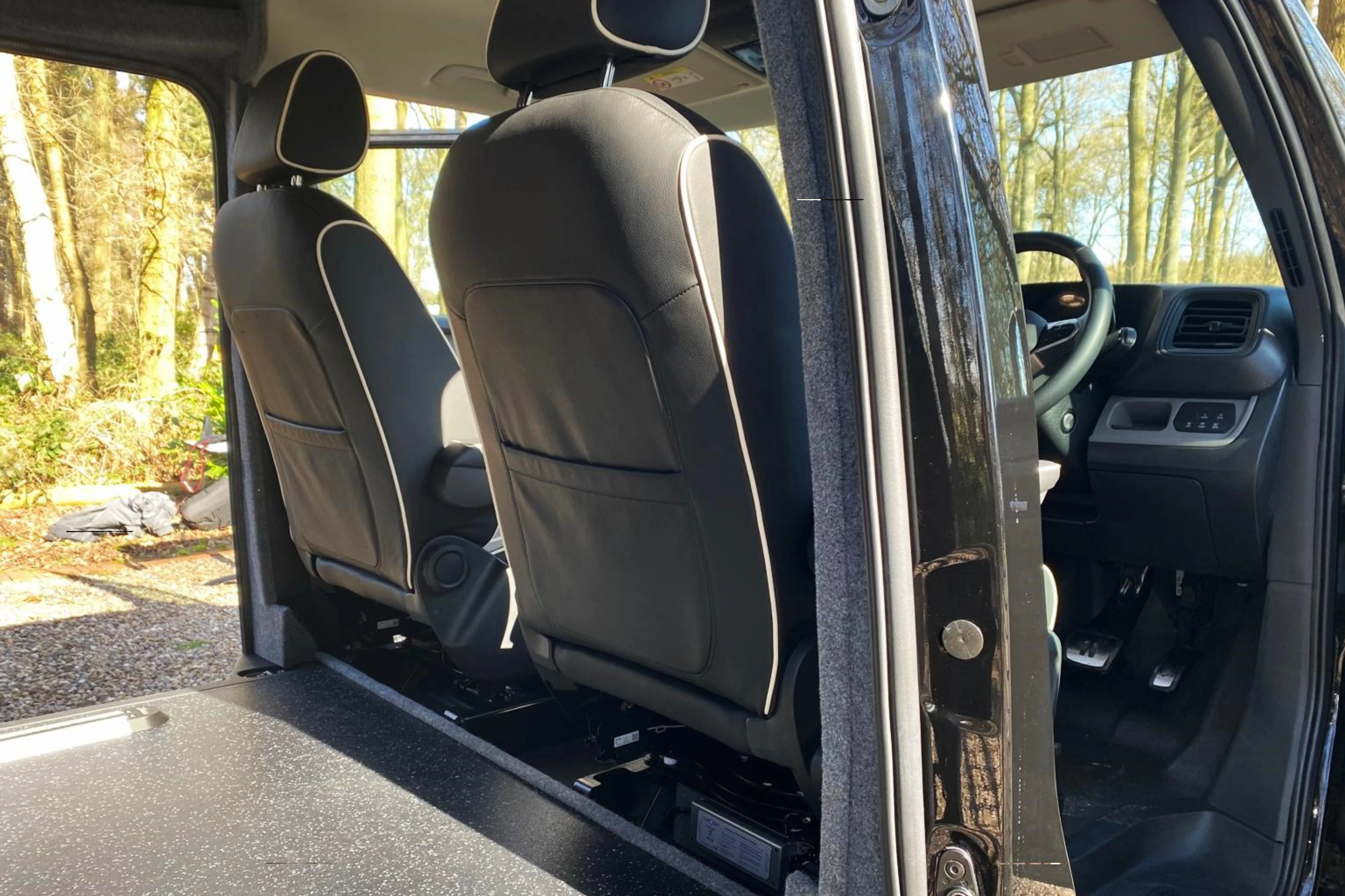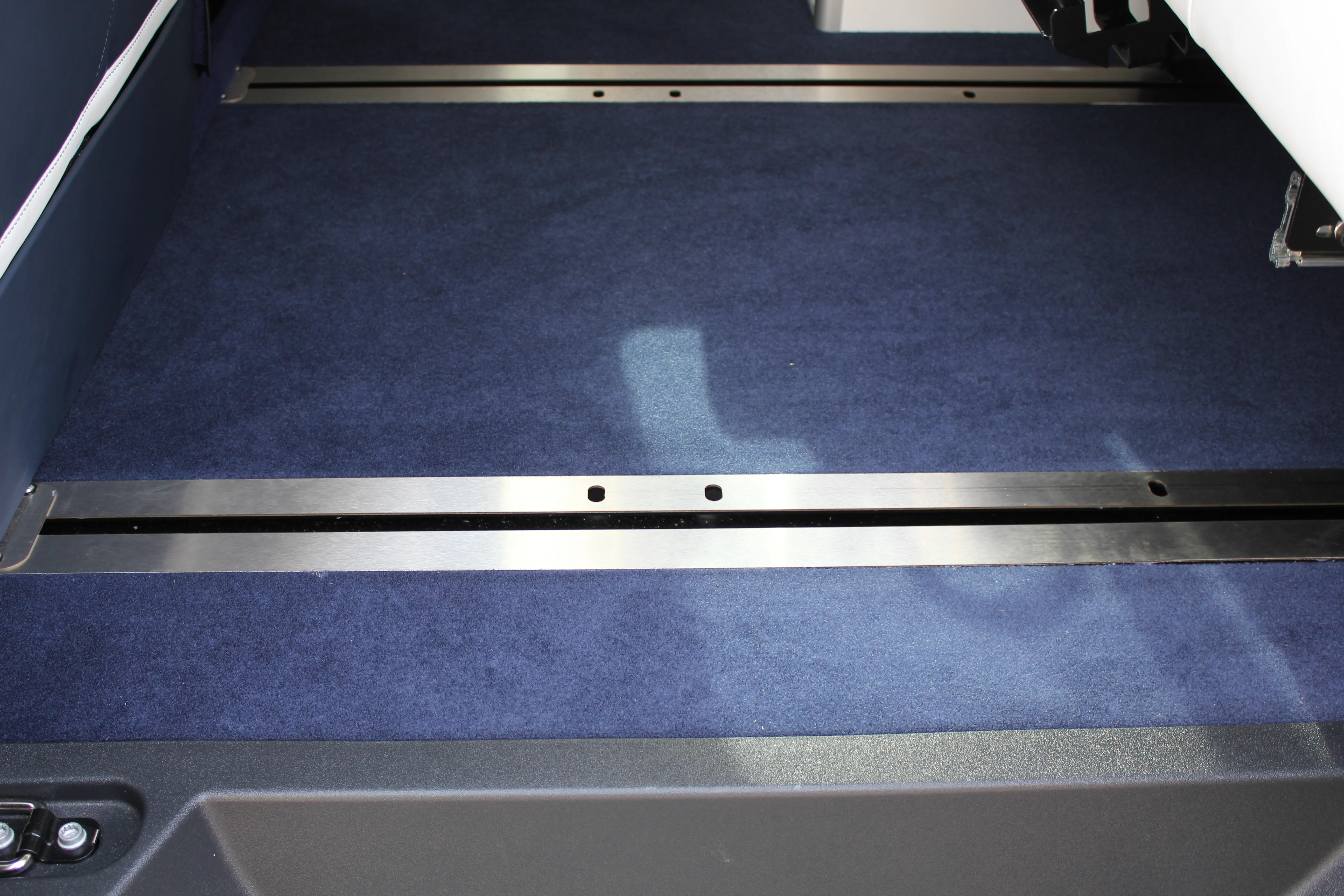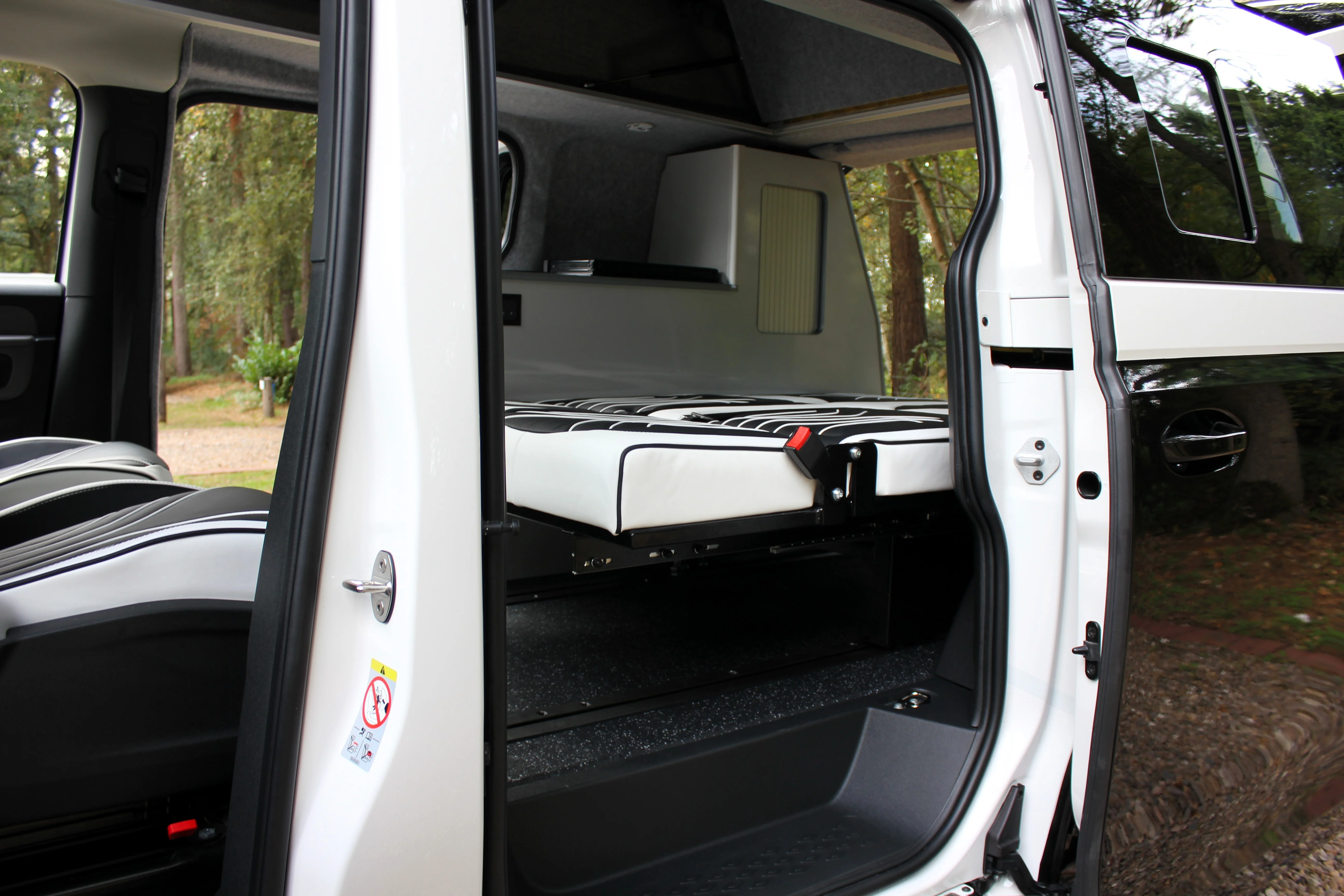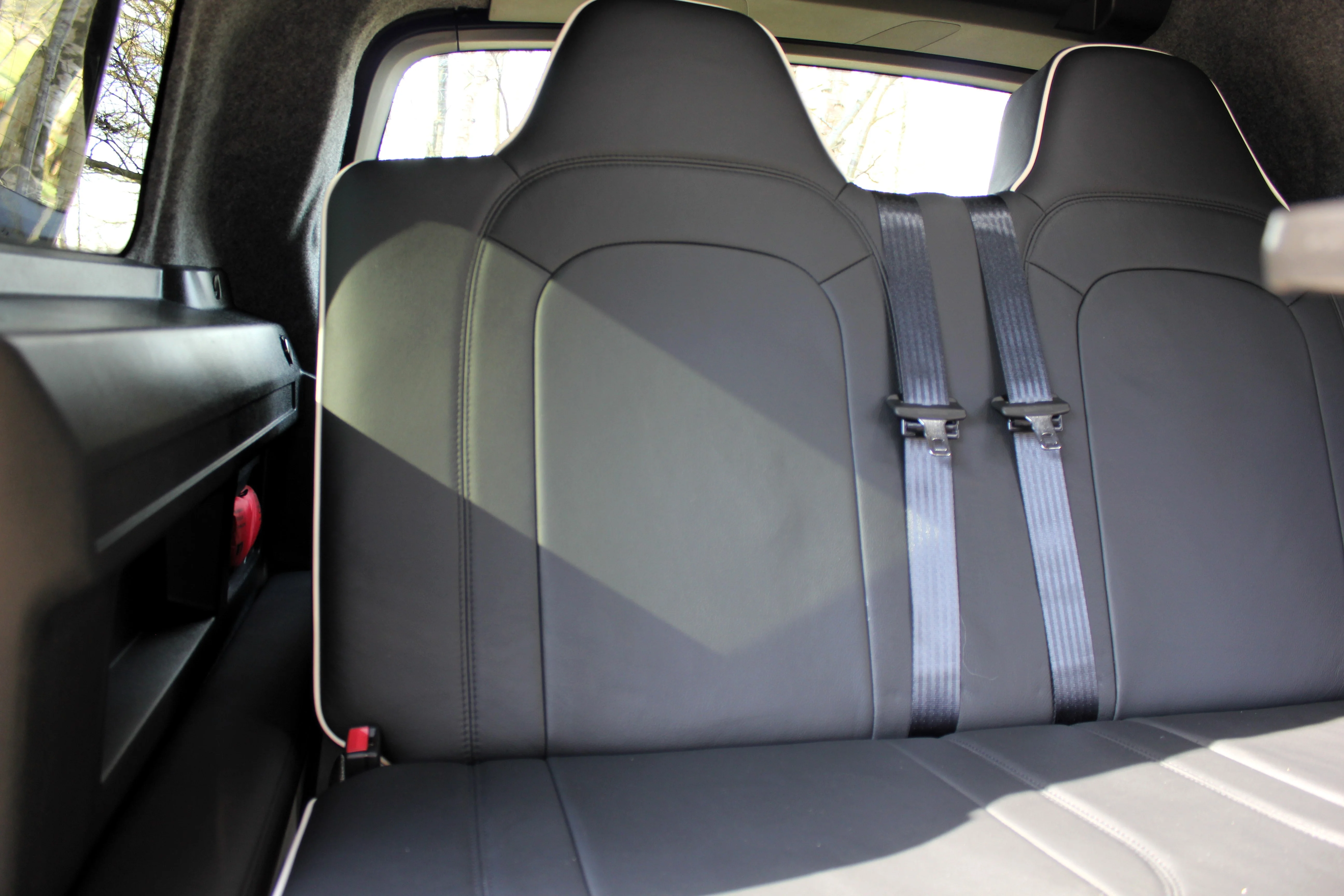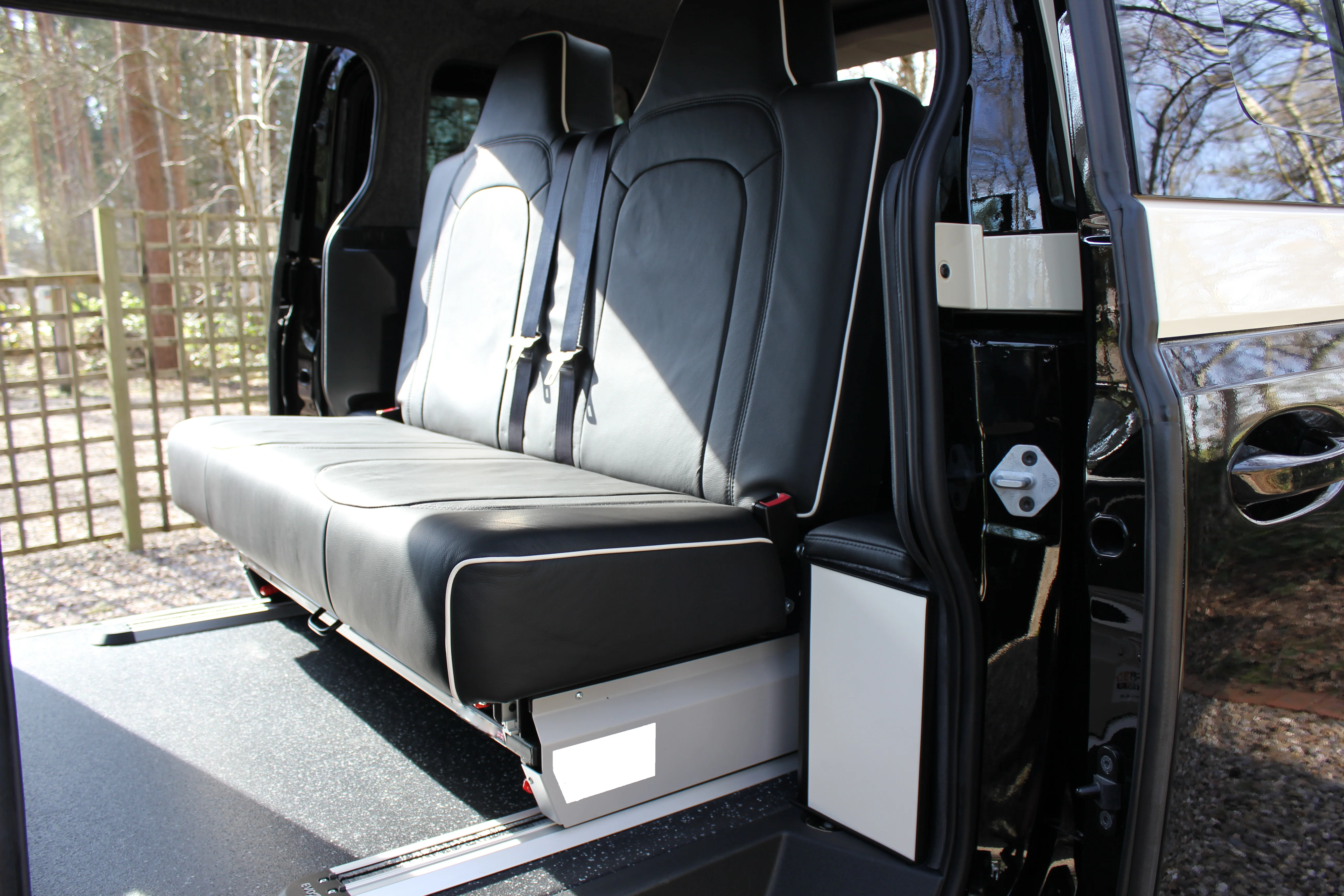 Electric M1 tested 2-seater Rock and Roll bed system upholstered in VW trim, with integrated floor rails