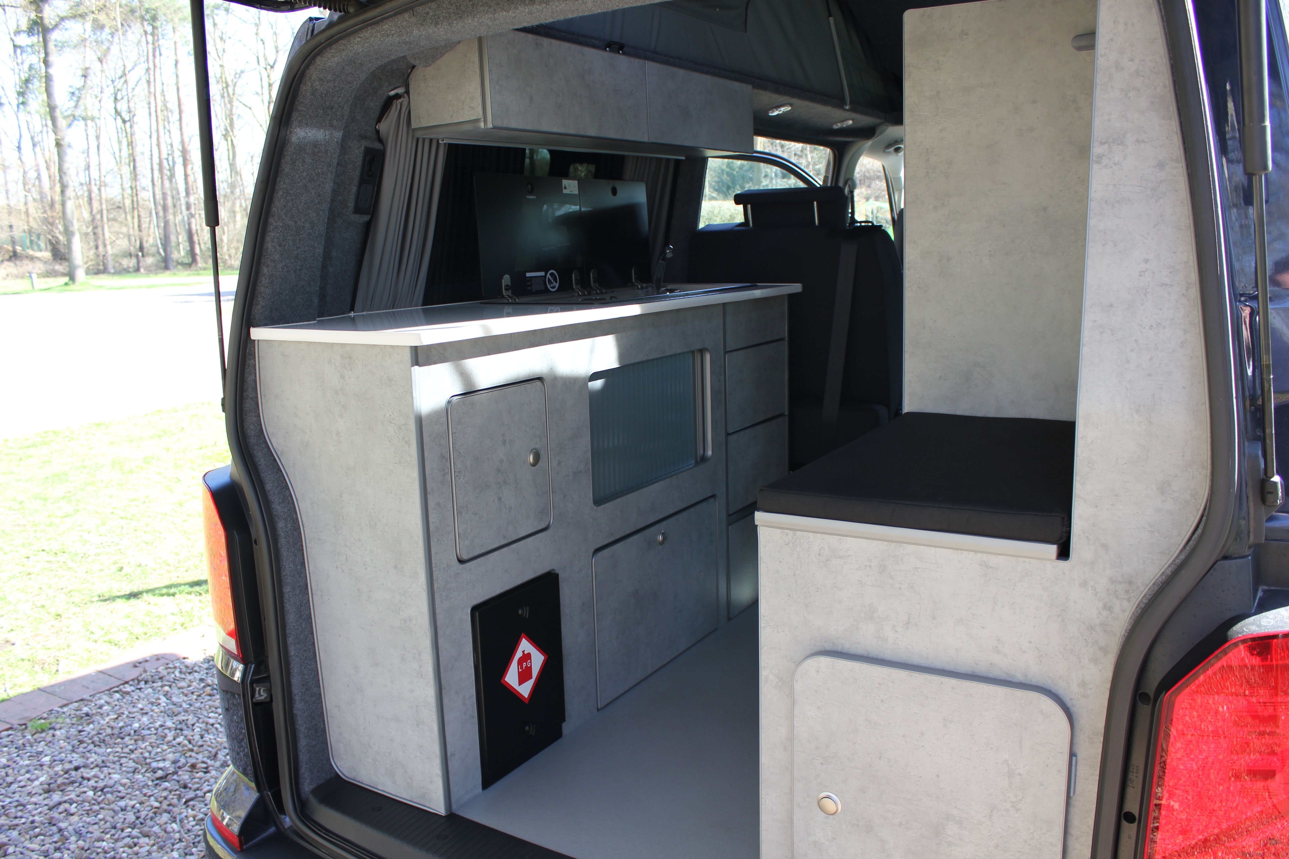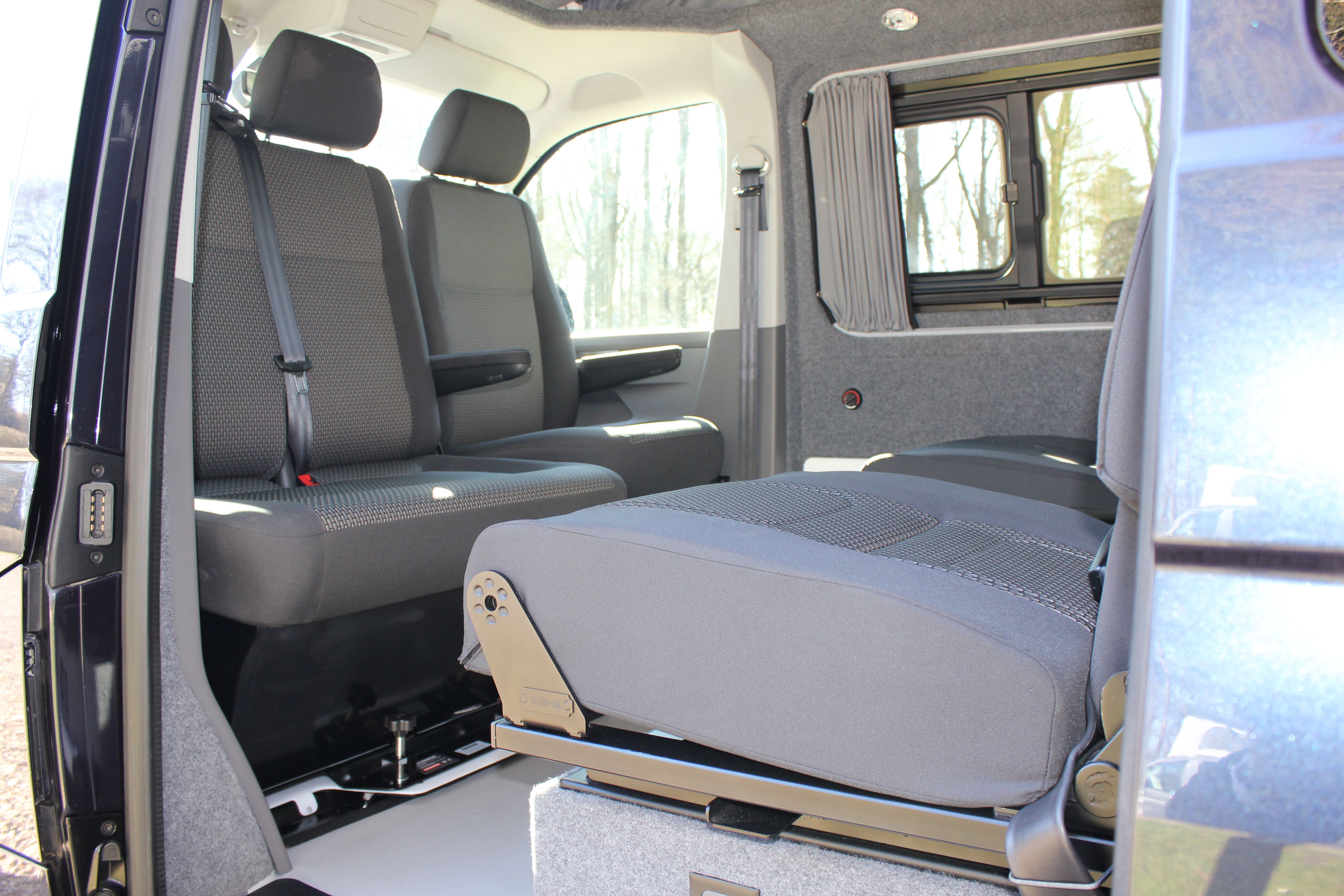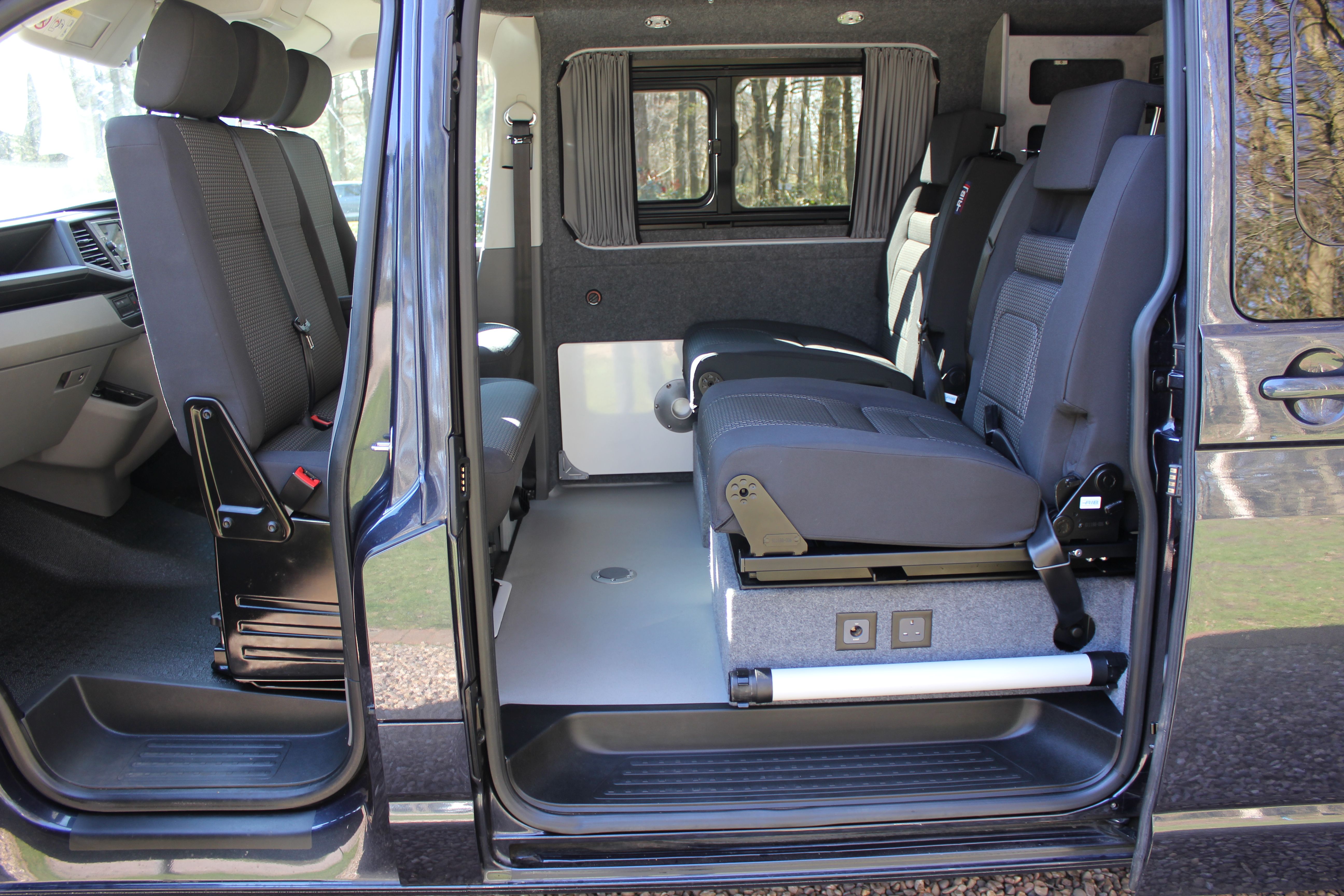 LWB VW T6.1 DSG self-sufficient campervan, complete with brand new coast2coast Campers Harvington rear end kitchen conversion and fitted flush toilet.