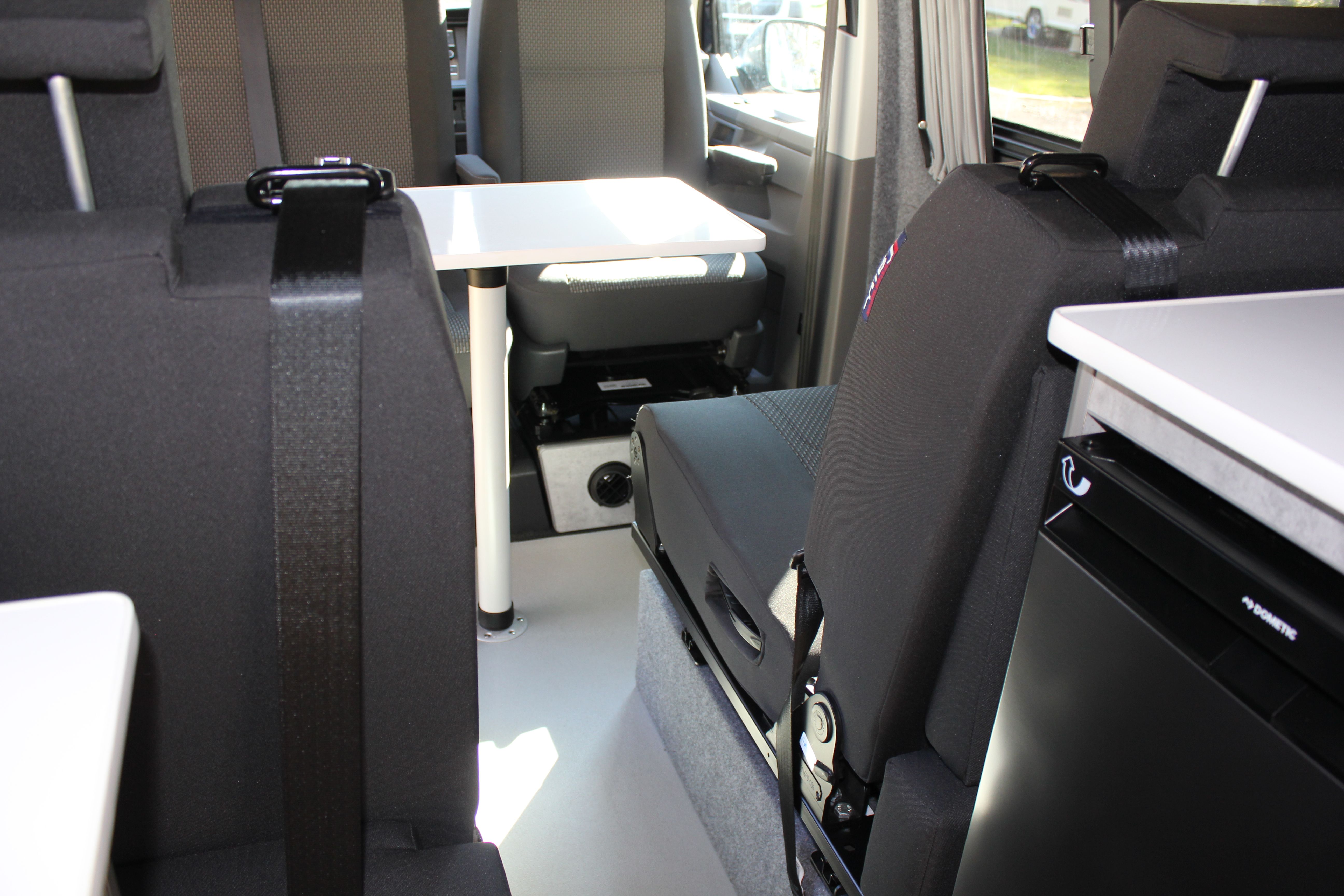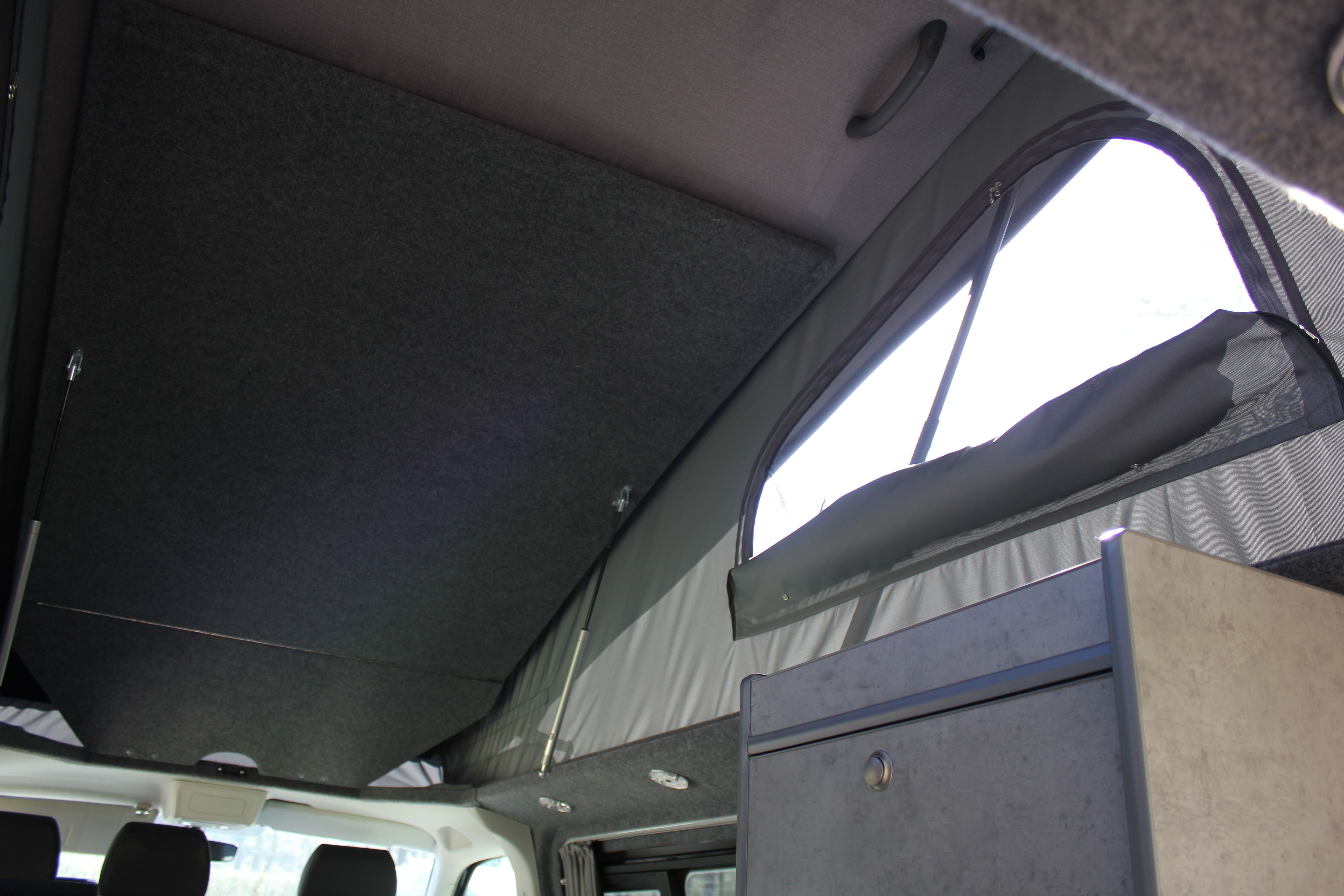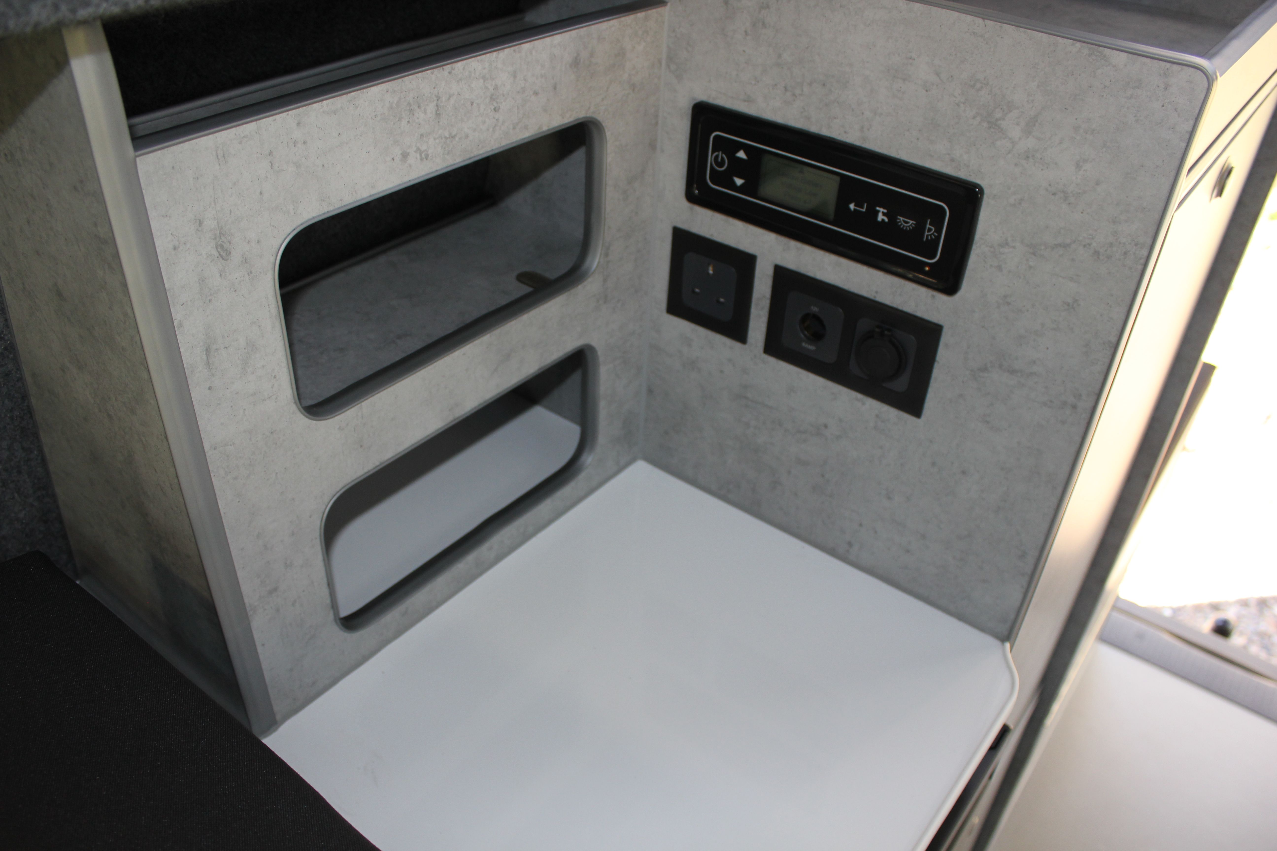 Our Harvington self sufficient camper conversion layout features a rear kitchen area, to offer a more flexible camping layout. Our flagship design with a reverse style layout and rear elevating roof this layout allows for more room at the rear of the campervan giving you a large rear galley style kitchen area with lots of cupboards space. There’s even a fitted flush toilet system!