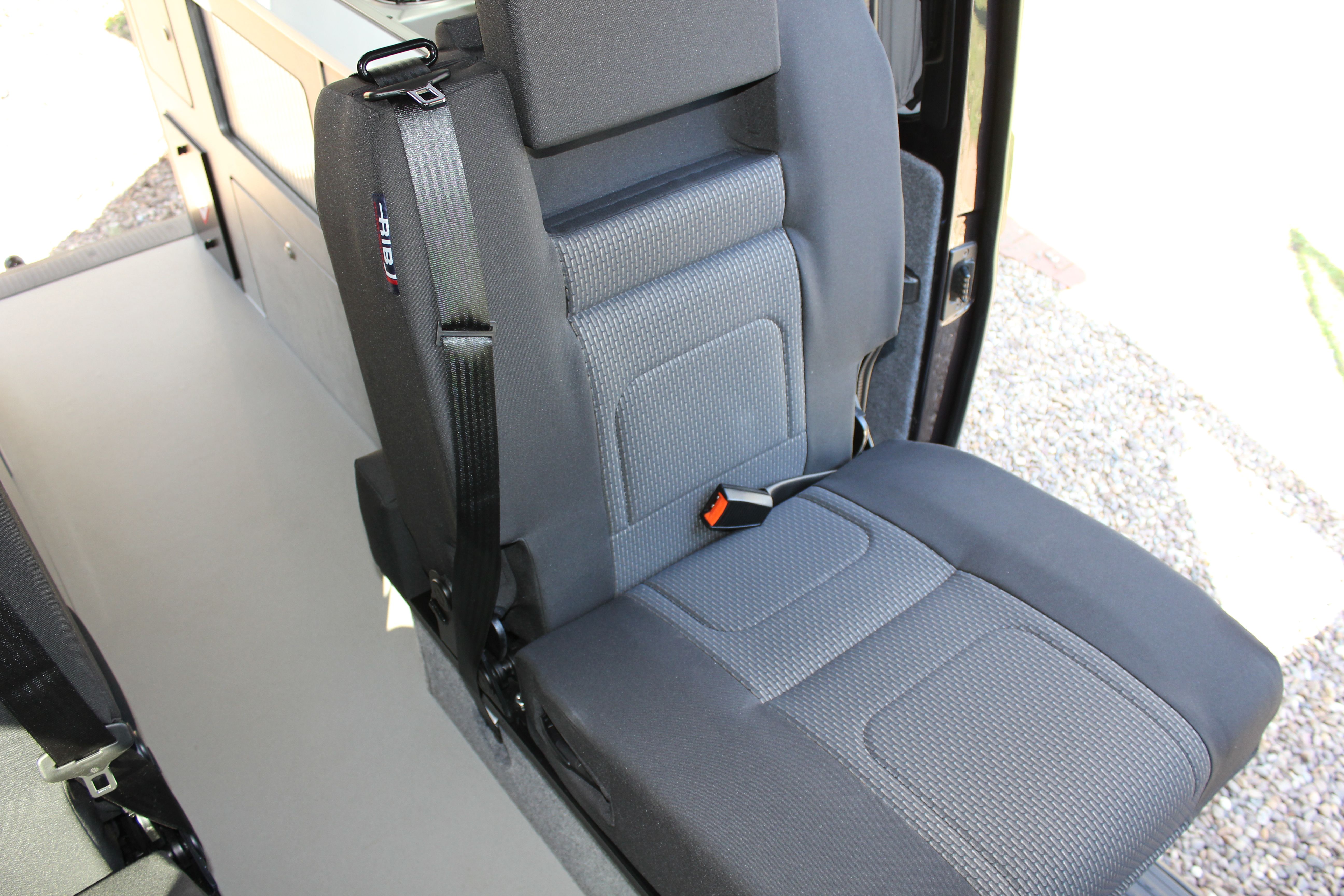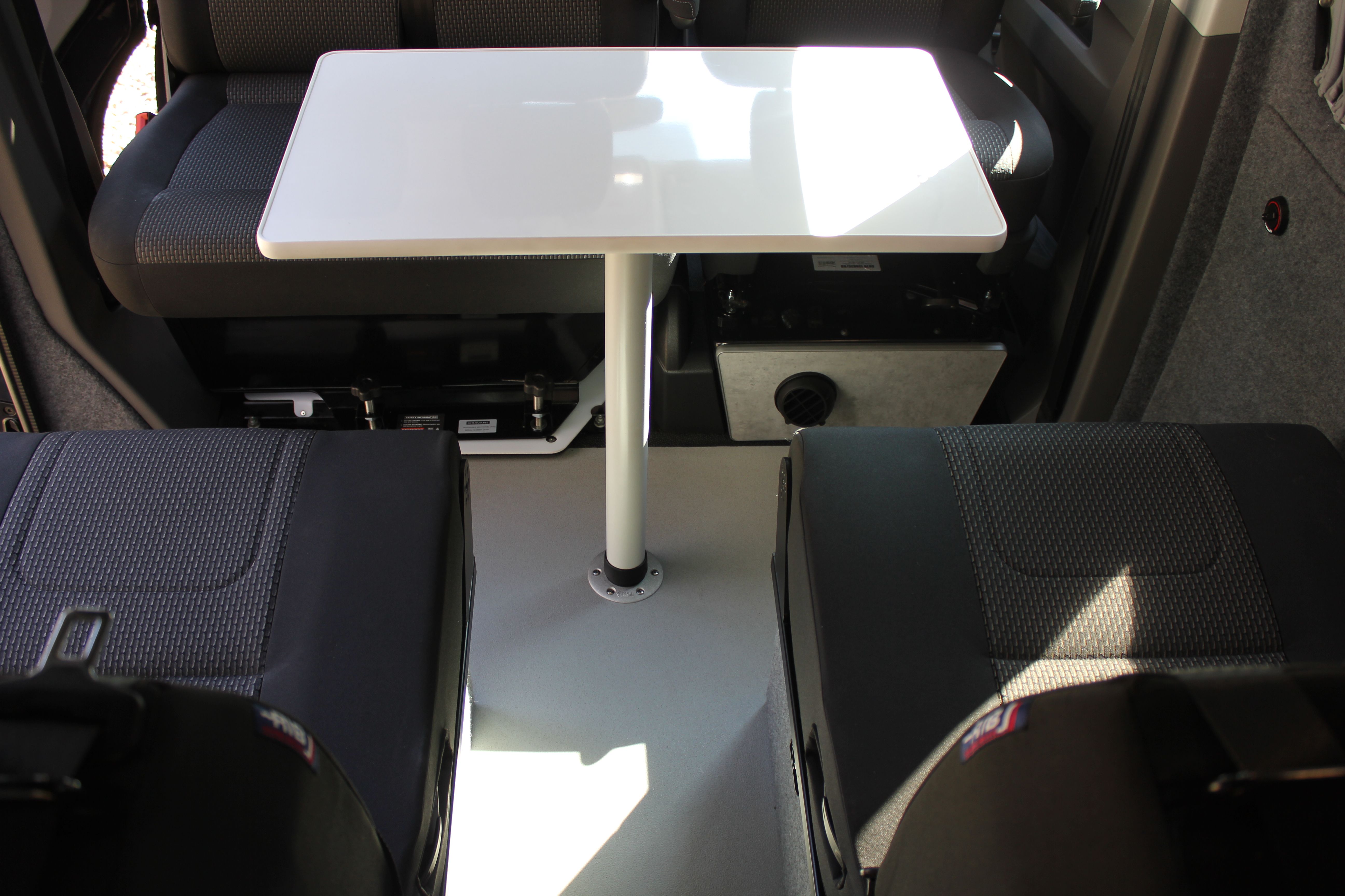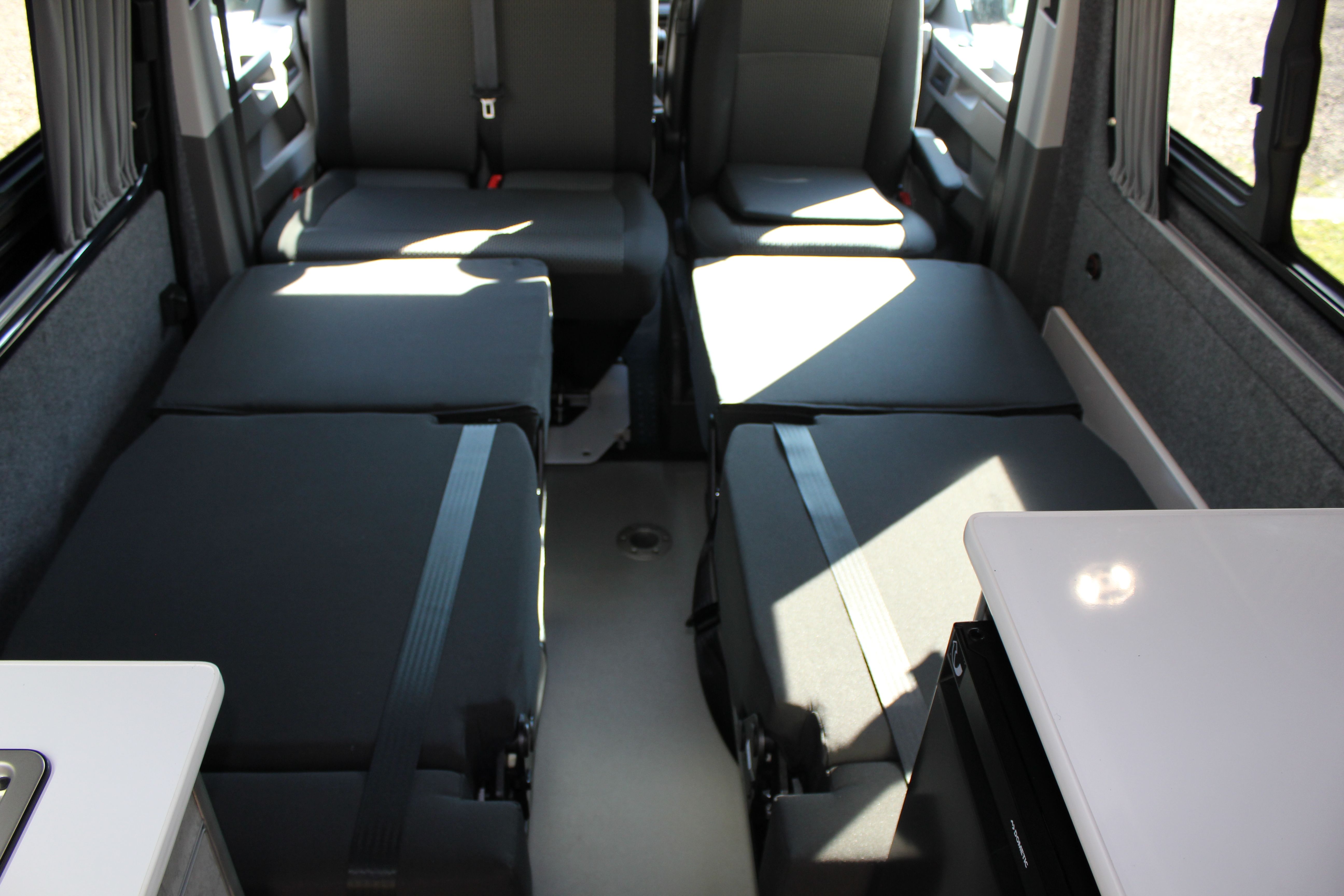 Our Harvington self sufficient camper conversion layout features a rear kitchen area, to offer a more flexible camping layout. Our flagship design with a reverse style layout and rear elevating roof this layout allows for more room at the rear of the campervan giving you a large rear galley style kitchen area with lots of cupboards space. There’s even a fitted flush toilet system!