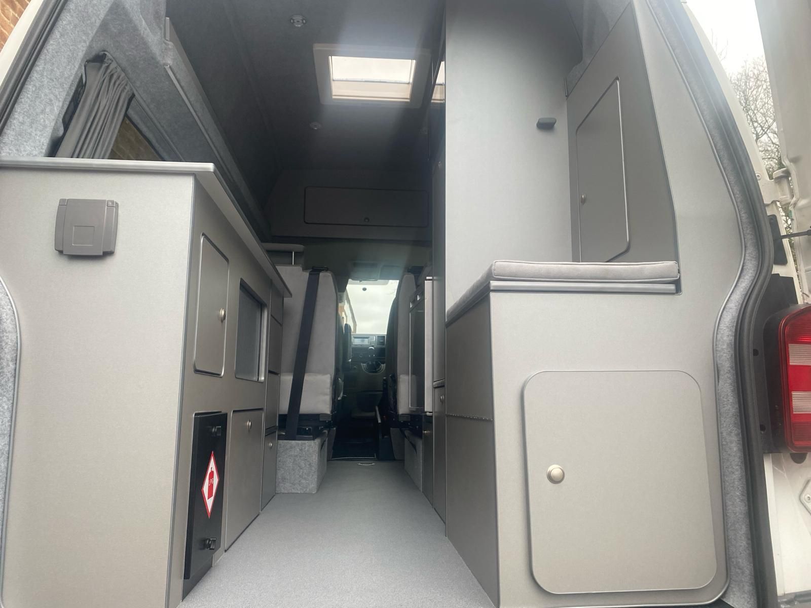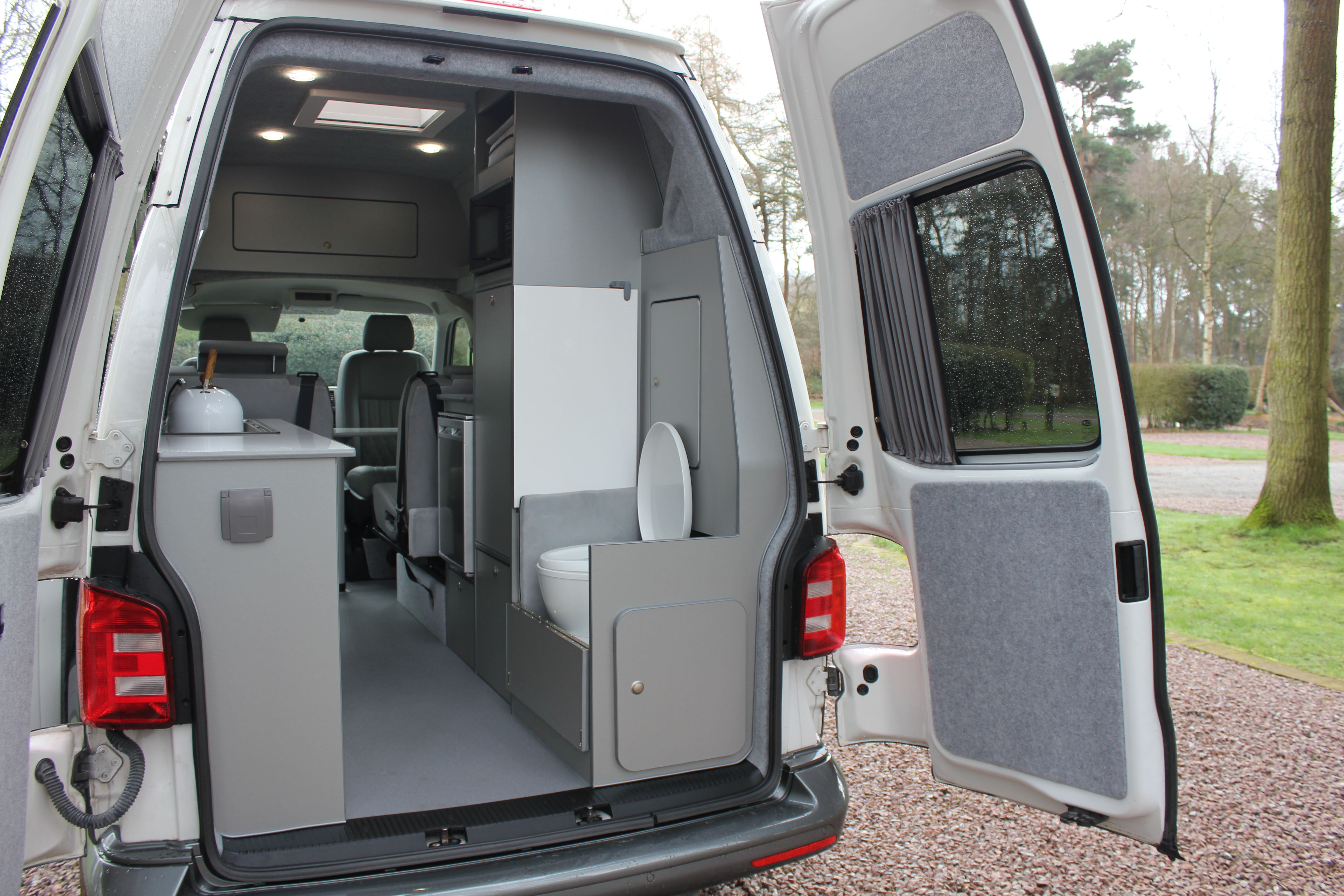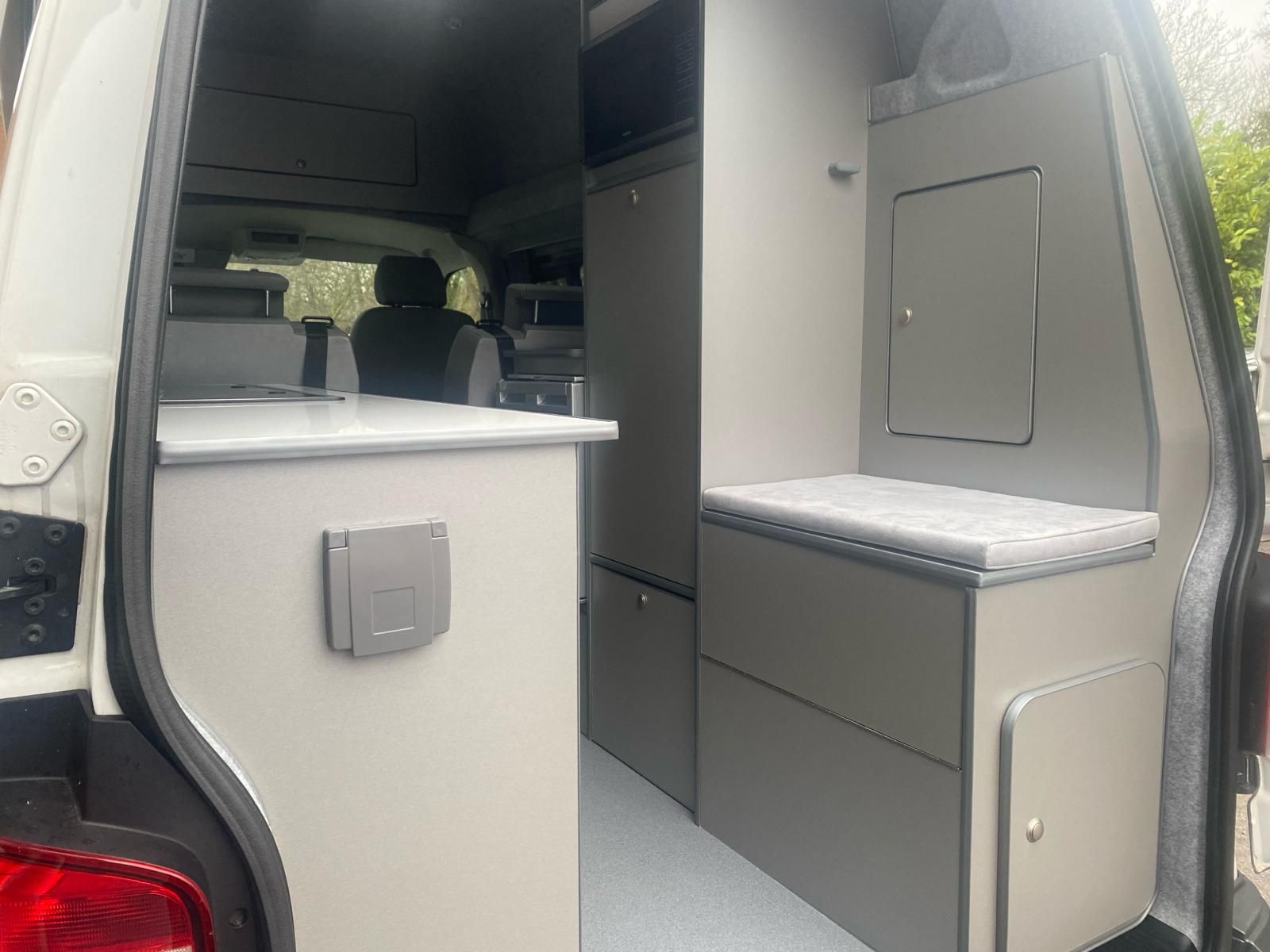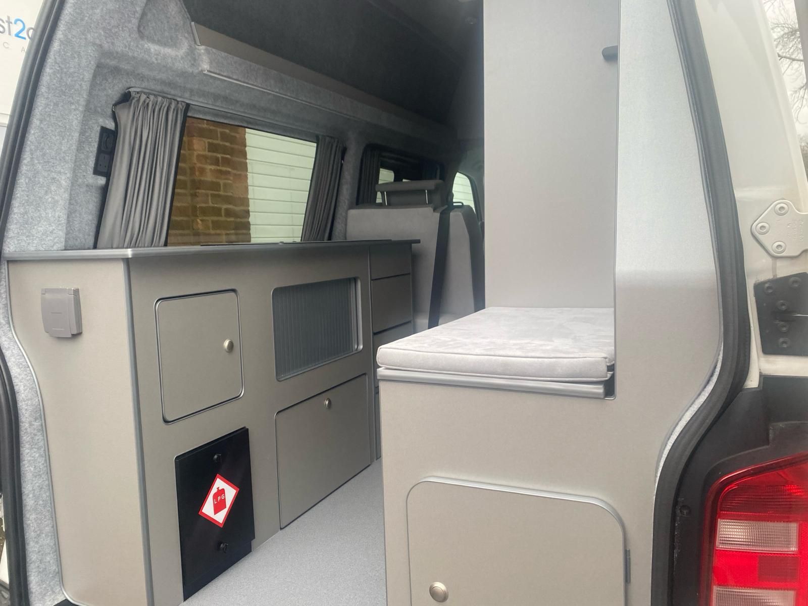 2019 VW LWB T6 2 LTR (102PS) Manual with Volkswagen factory fitted high top roof, complete with coast2coast Campers Harvington rear kitchen campervan layout, with fitted flush toilet system.