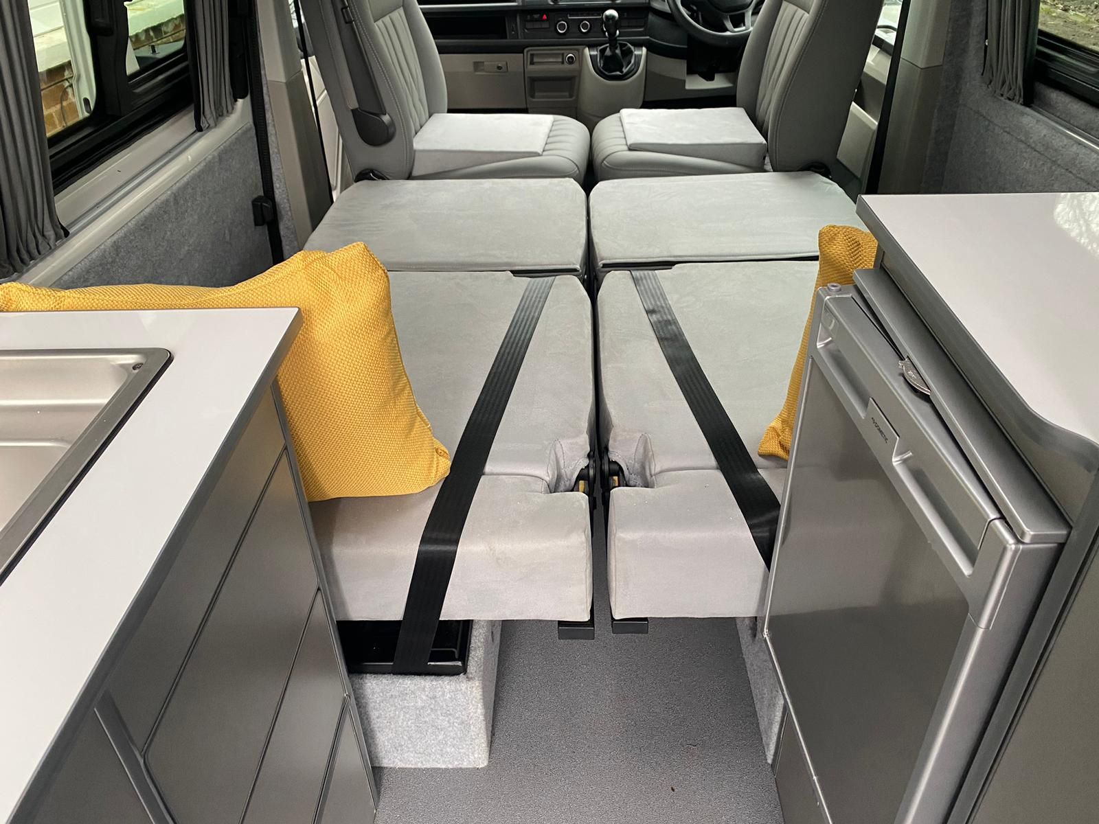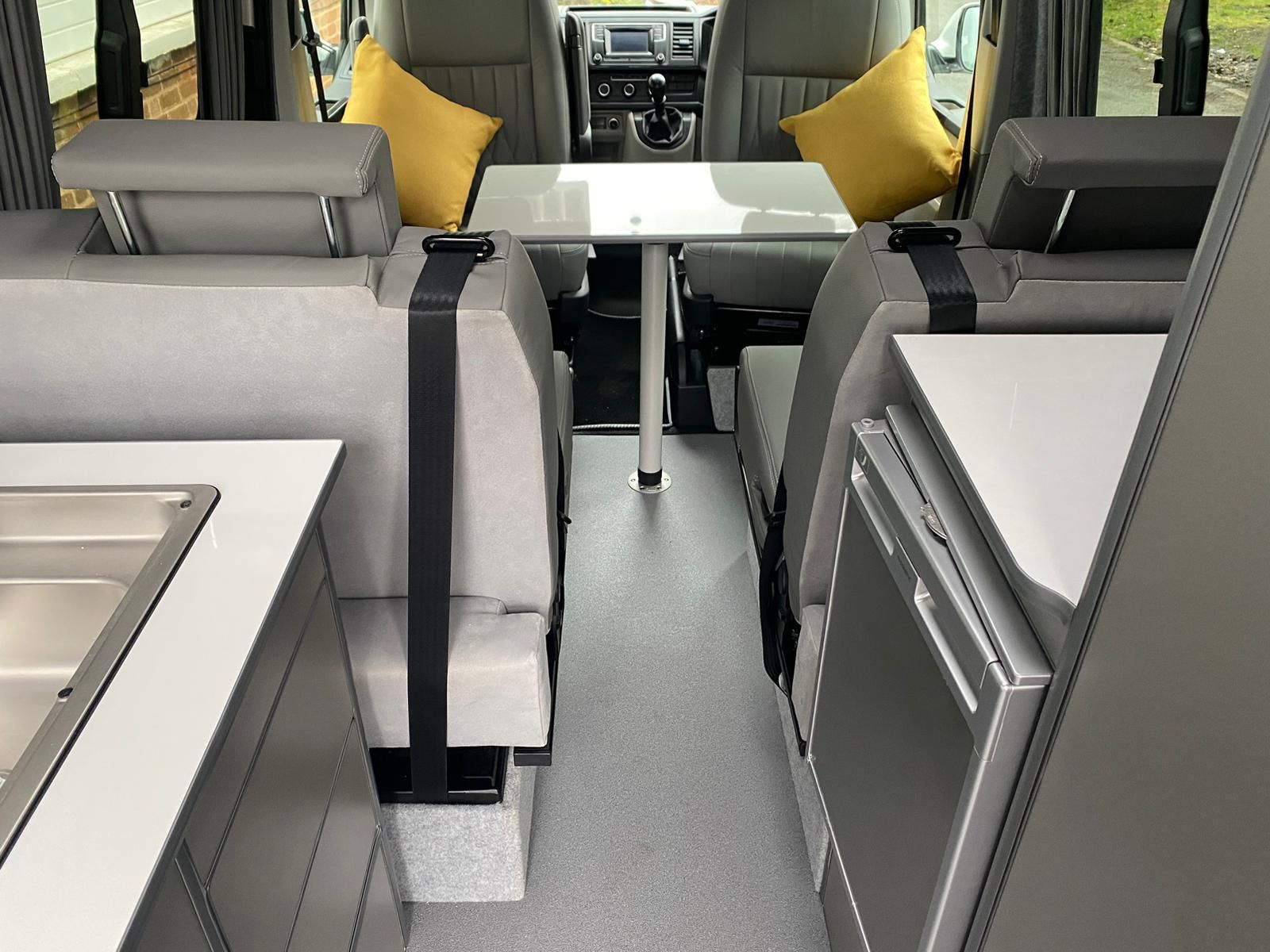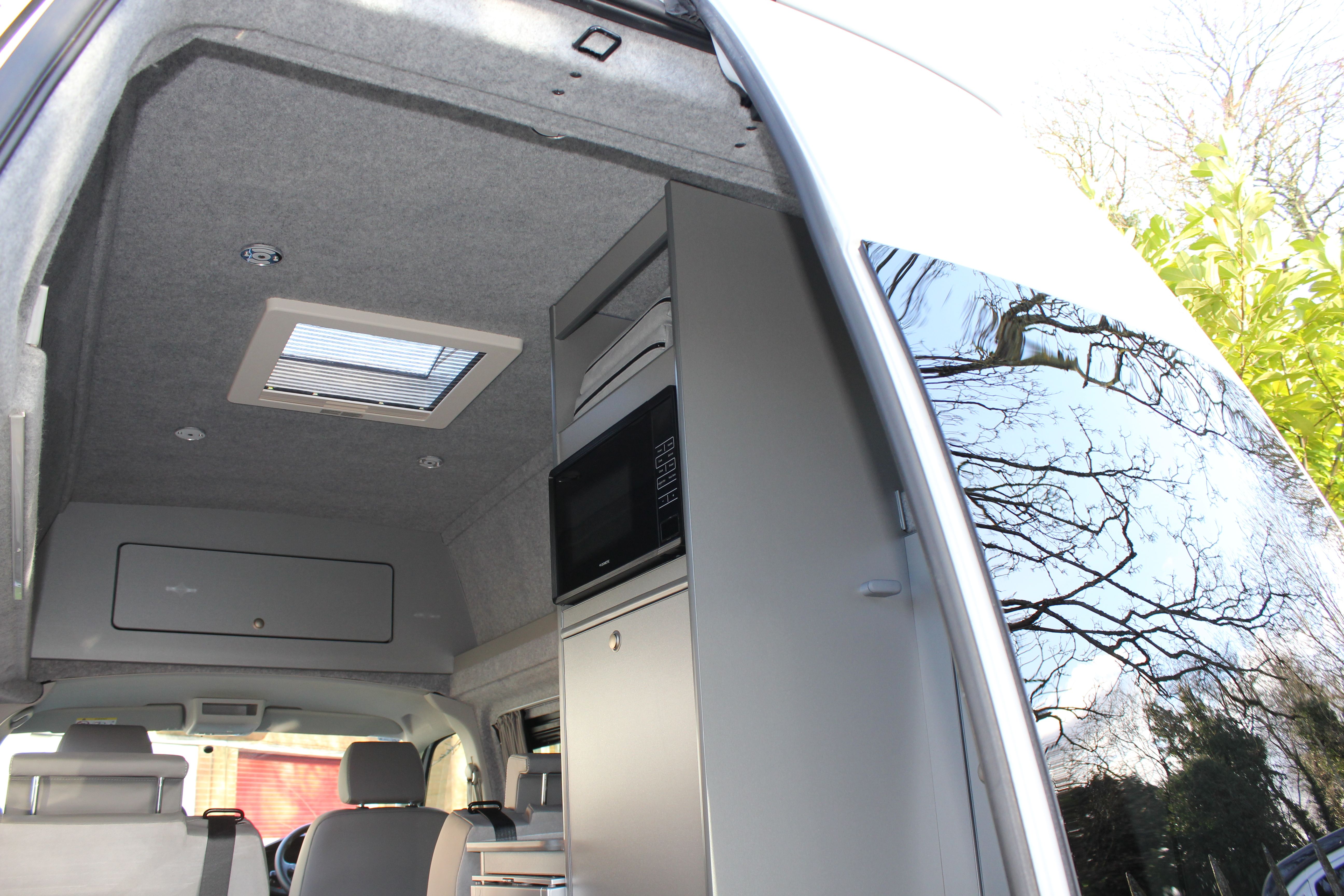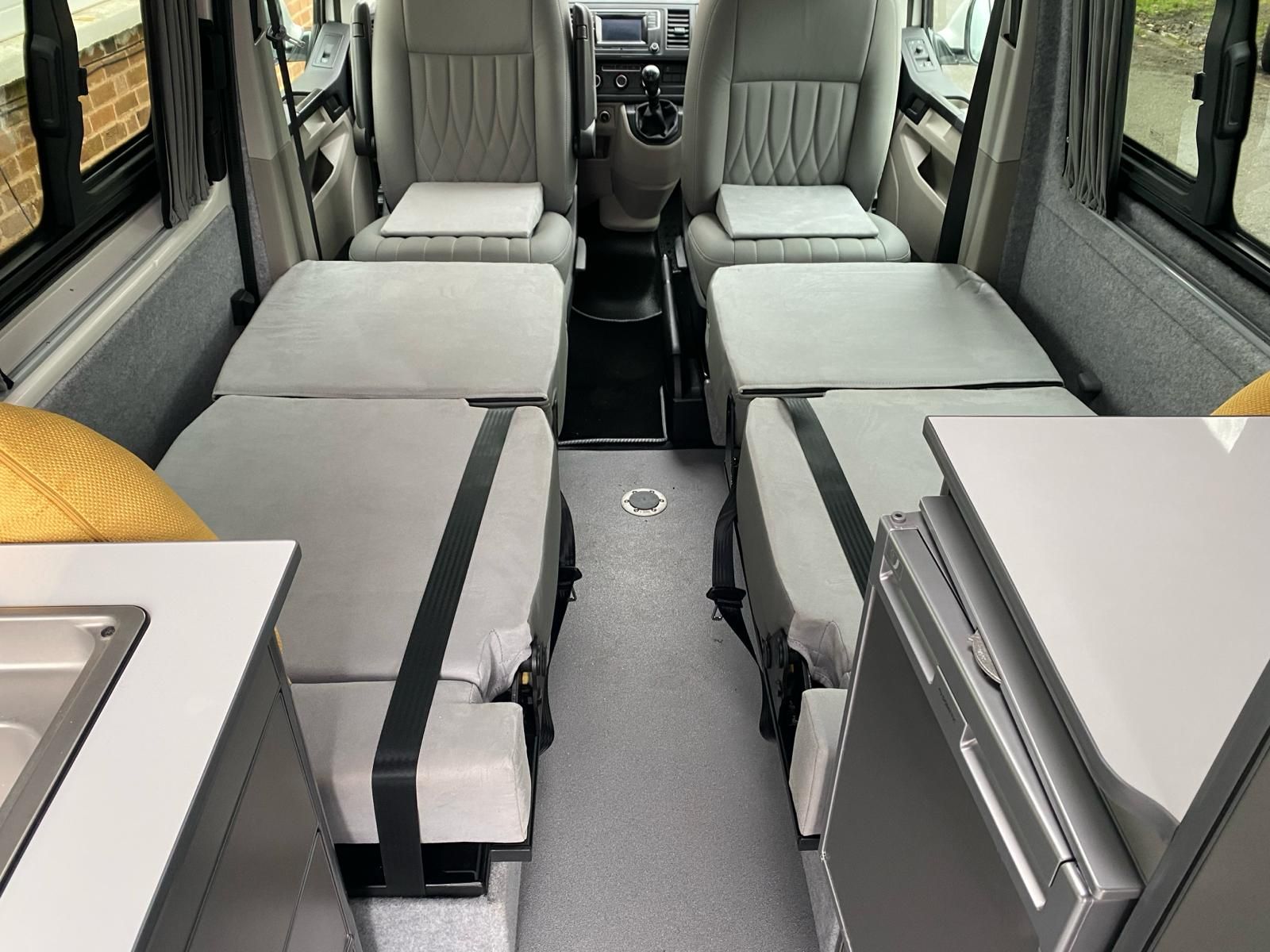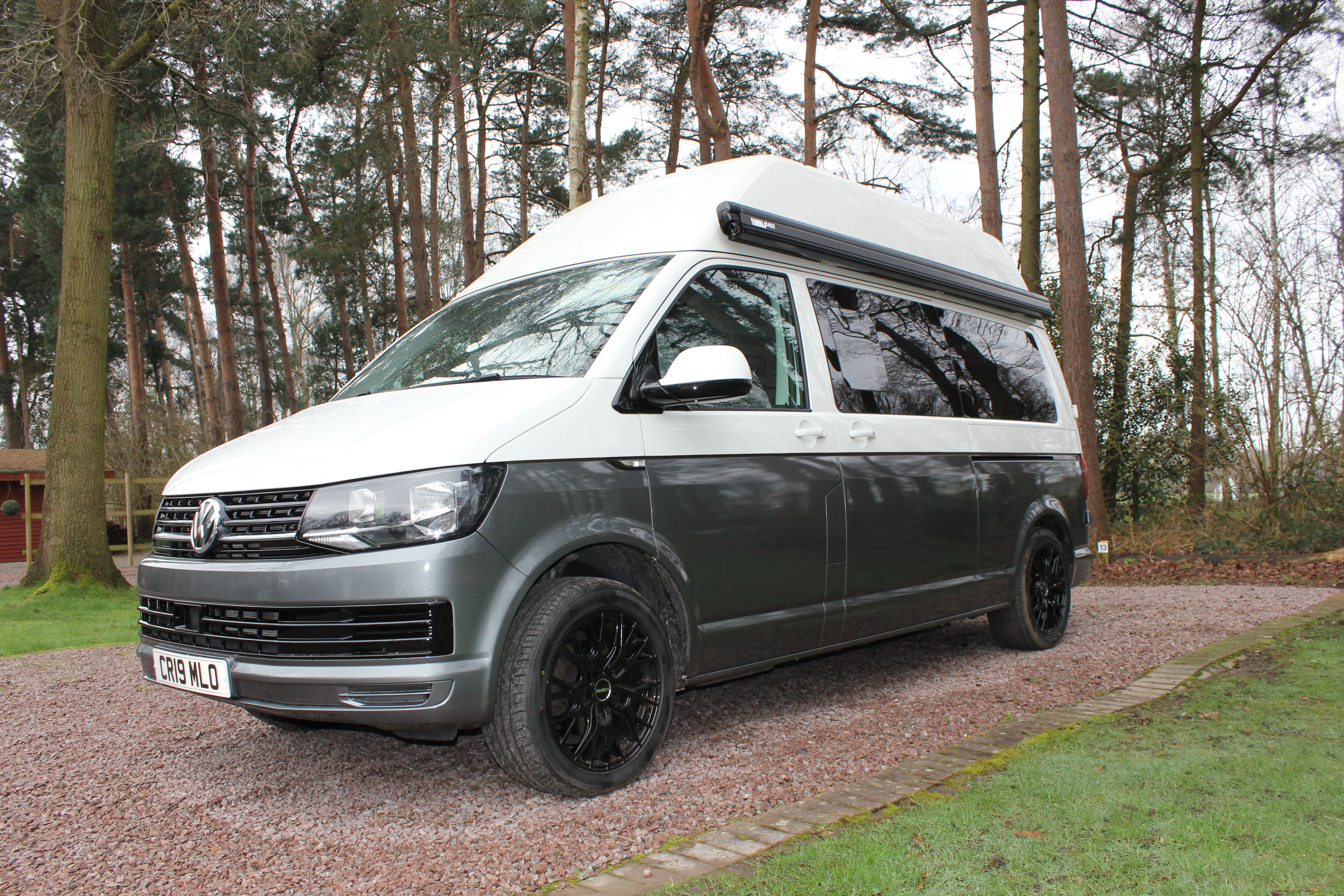 2019 VW LWB T6 2 LTR (102PS) Manual with Volkswagen factory fitted high top roof, complete with coast2coast Campers Harvington rear kitchen campervan layout, with fitted flush toilet system.