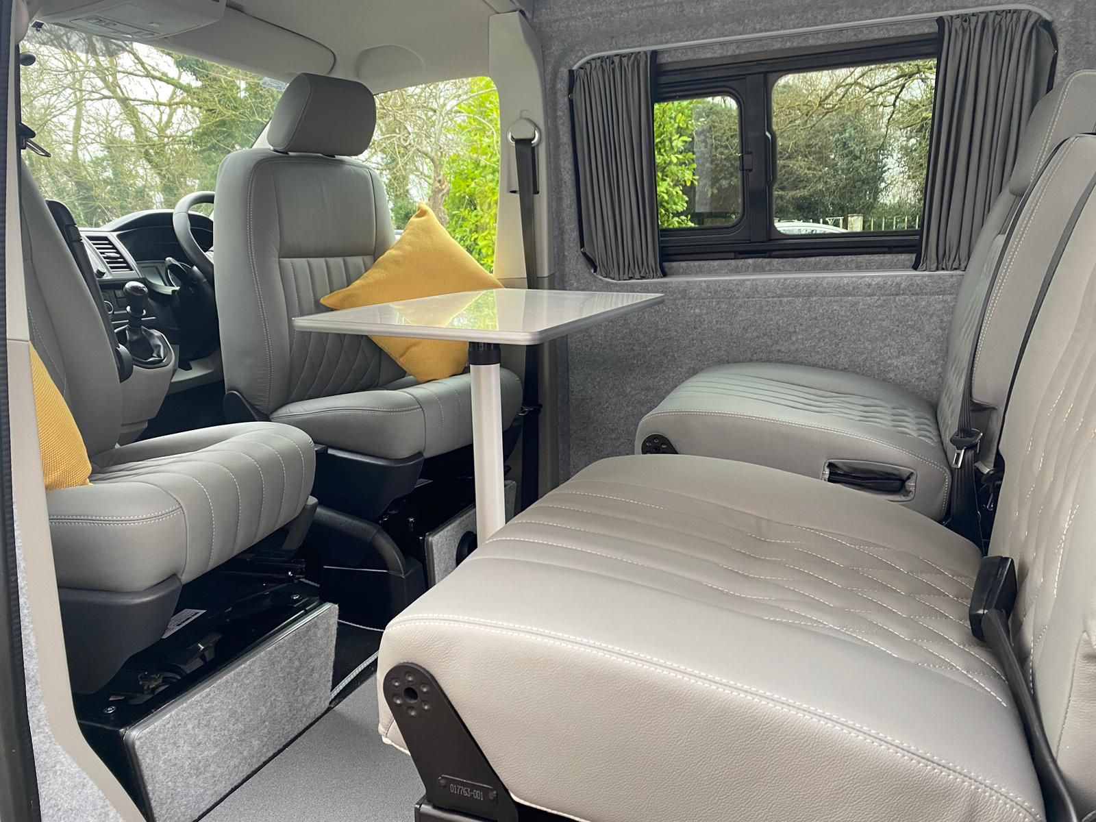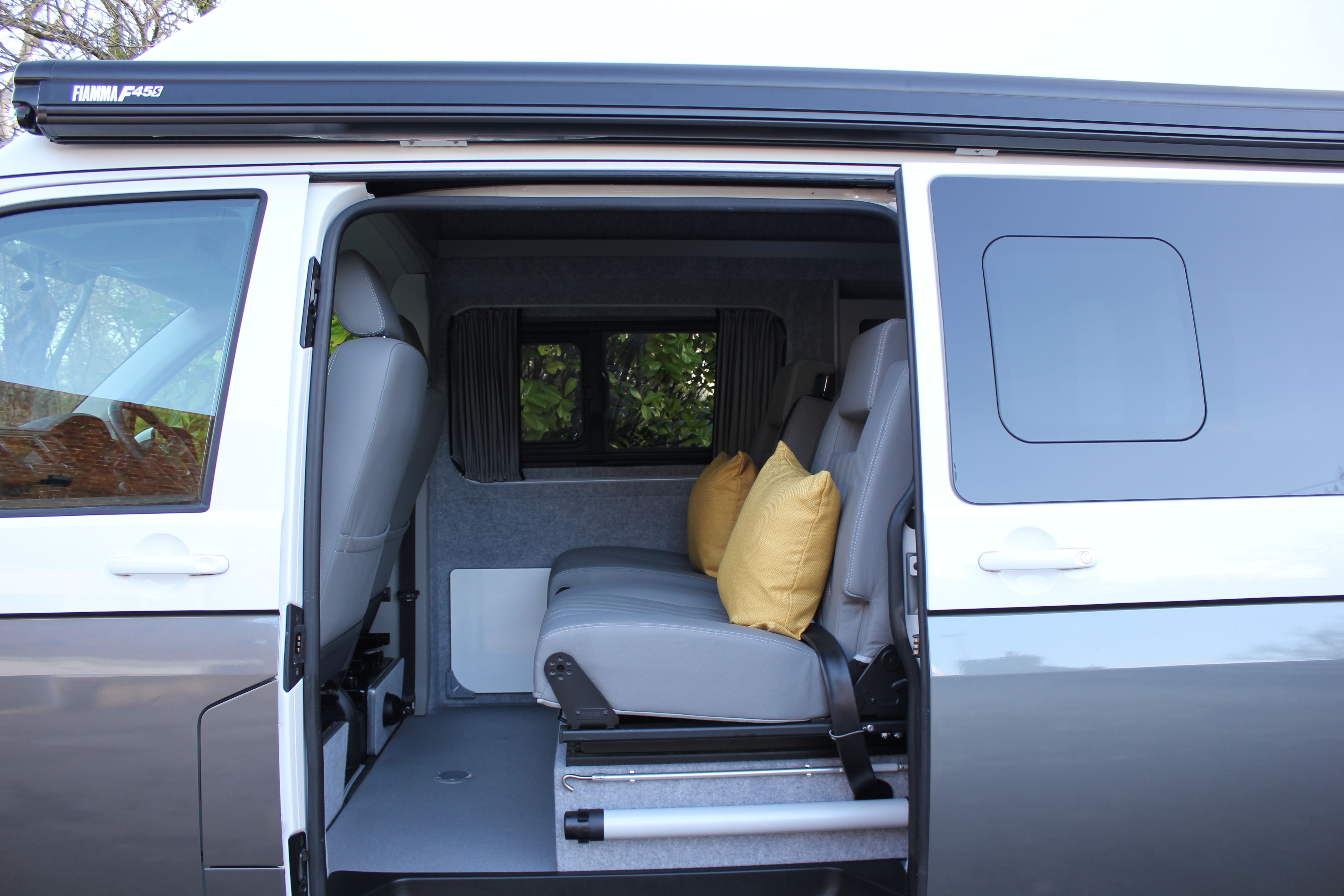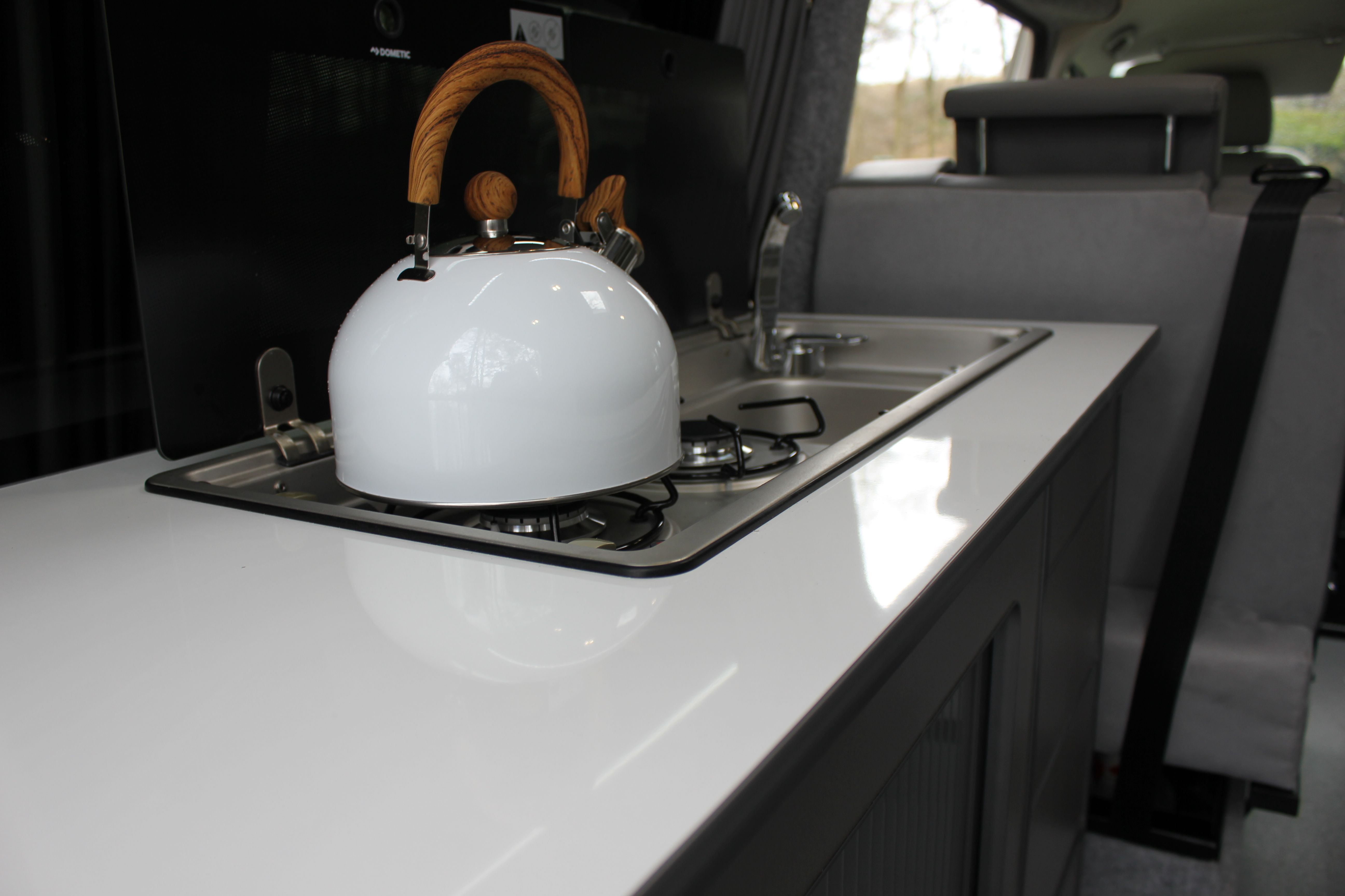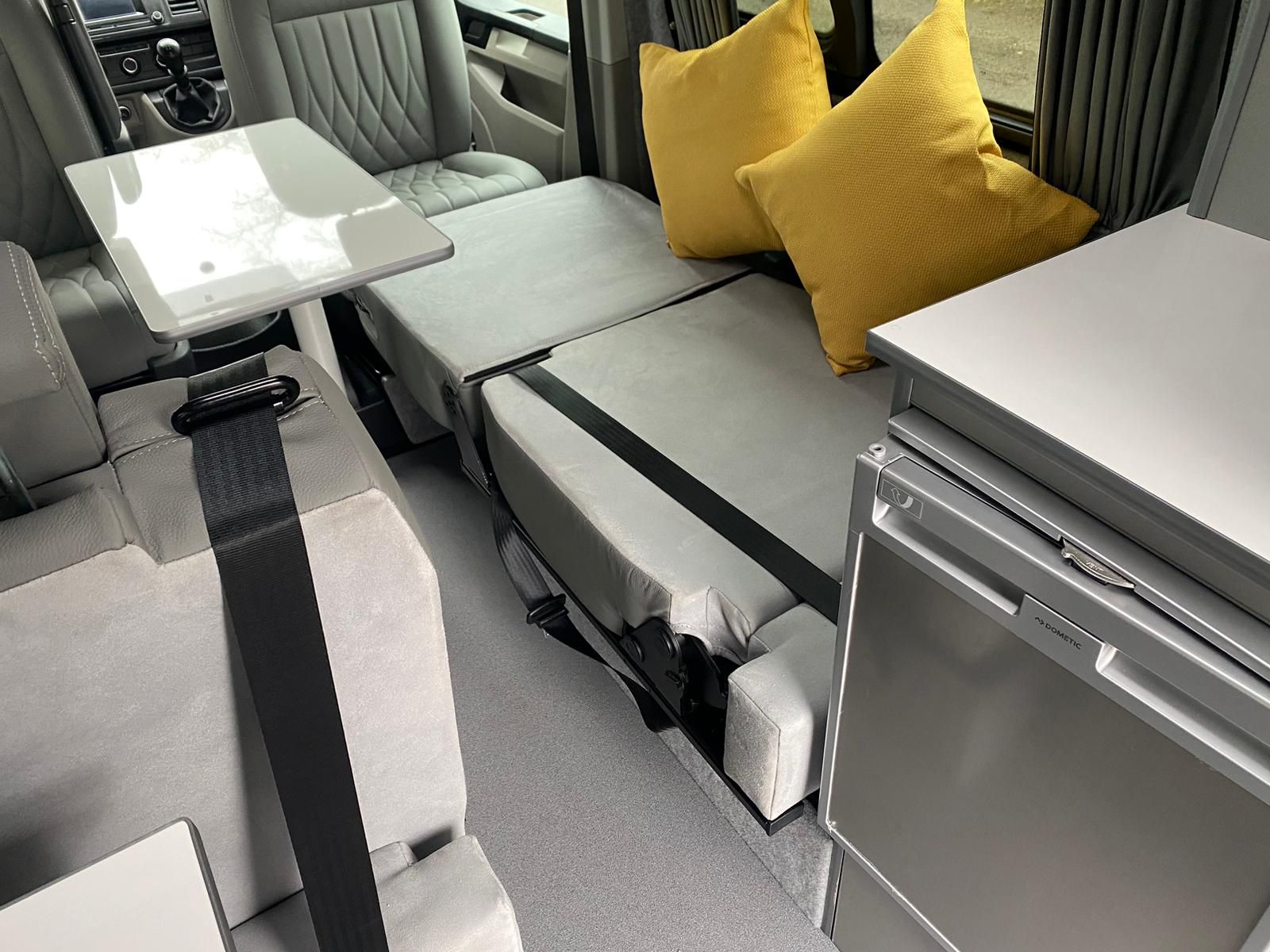 2019 VW LWB T6 2 LTR (102PS) Manual with Volkswagen factory fitted high top roof, complete with coast2coast Campers Harvington rear kitchen campervan layout, with fitted flush toilet system.