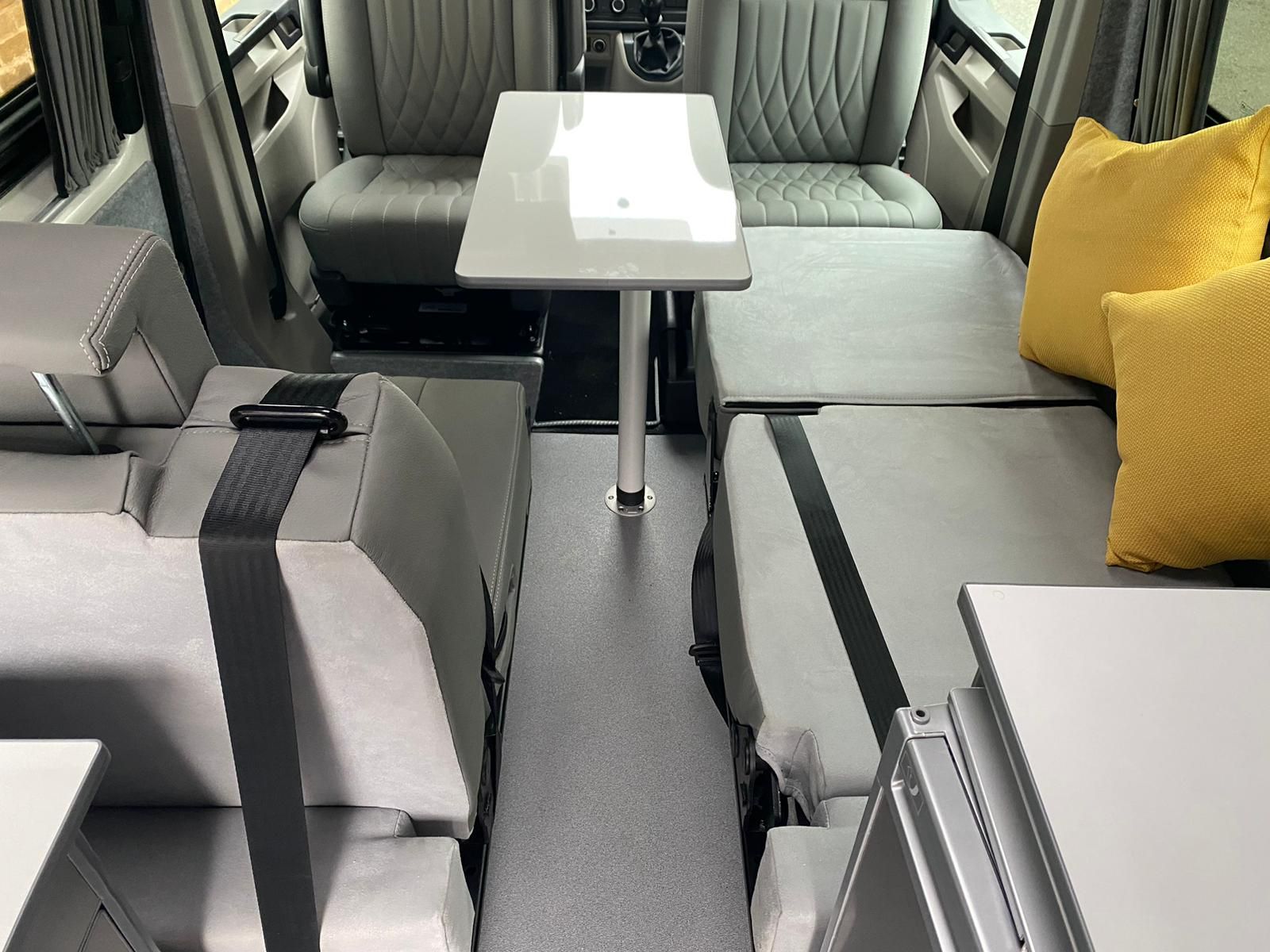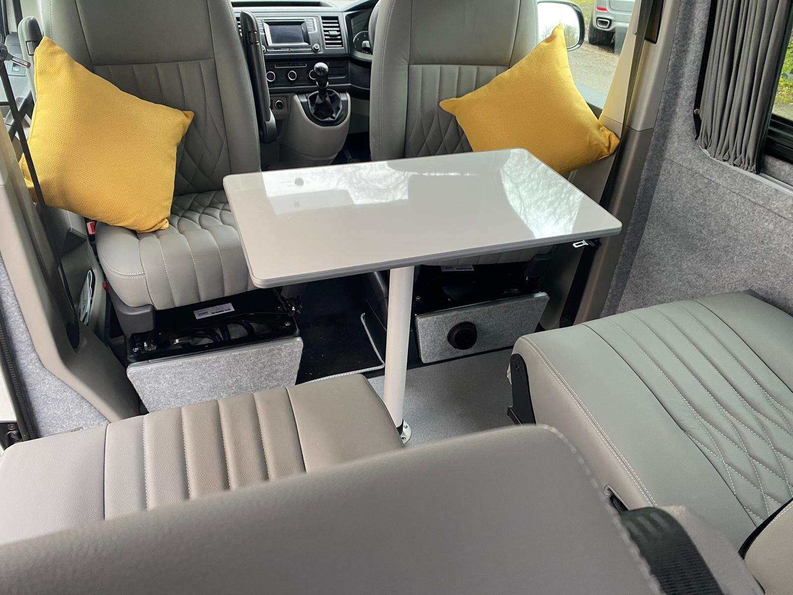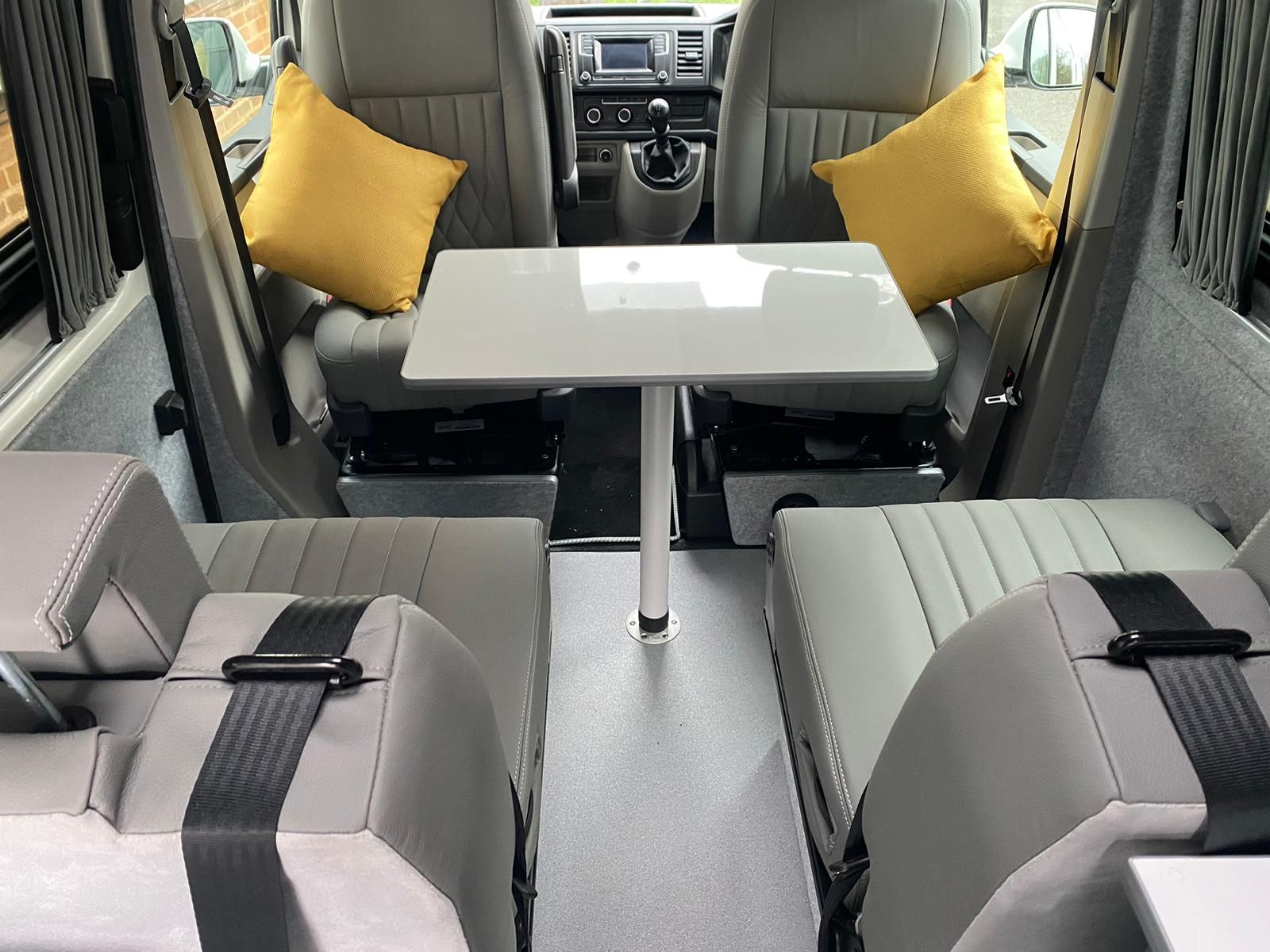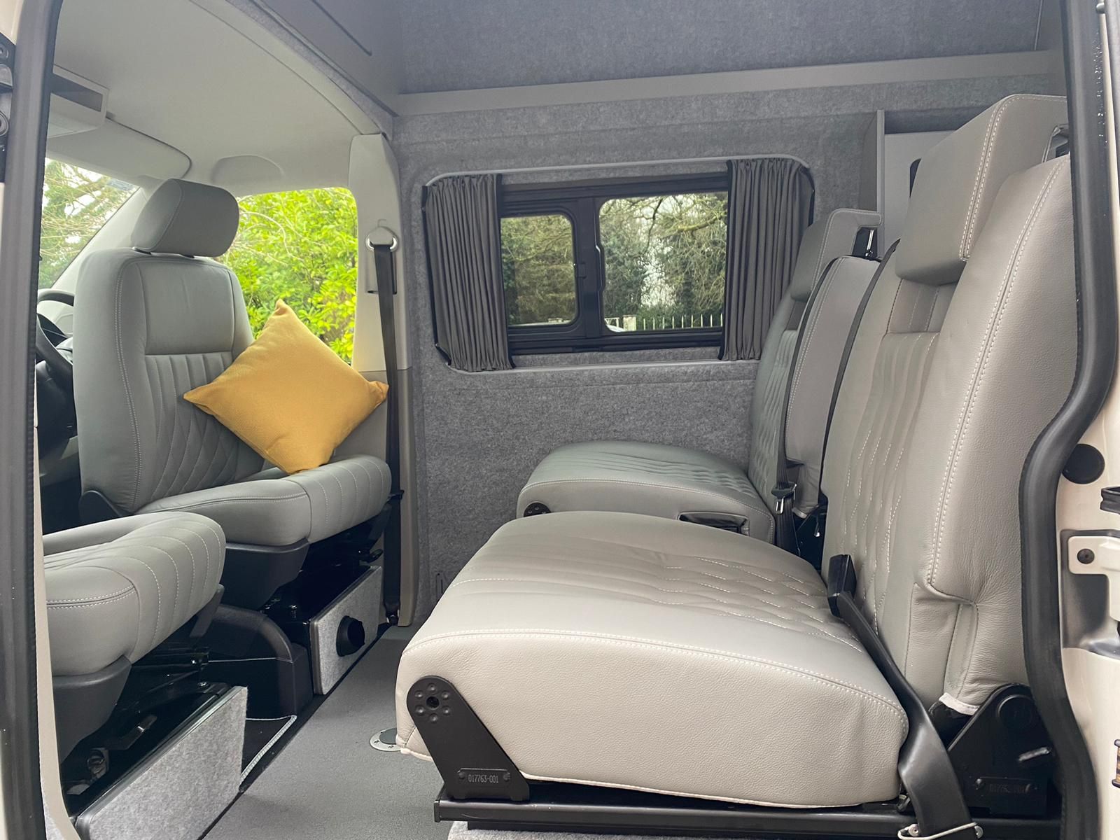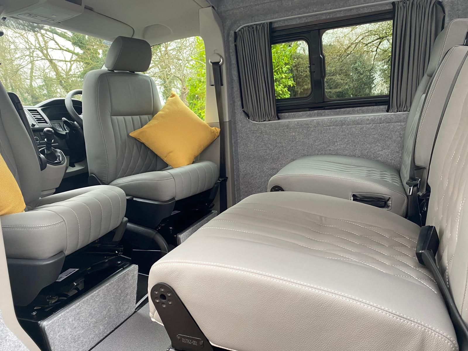 2019 VW LWB T6 2 LTR (102PS) Manual with Volkswagen factory fitted high top roof, complete with coast2coast Campers Harvington rear kitchen campervan layout, with fitted flush toilet system.