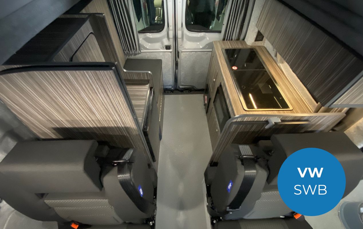 For parents wanting their children to sit closer to them near to the front of the camper or for couples planning a lot of travelling, our rear kitchen campervan conversion layouts make for comfortable wild camping, combined with great ‘go anywhere’ flexibility. With lots of storage space, this 4 or 5 seater, 2 or 4 berth family campervan boasts 2 single Neptune RIB M1 tested beds with sliders and integrated headrests, as standard, whilst offering housing space for a porta potti or fixed flush toilet. Add our heating and hot water system and you can even have a hot shower!